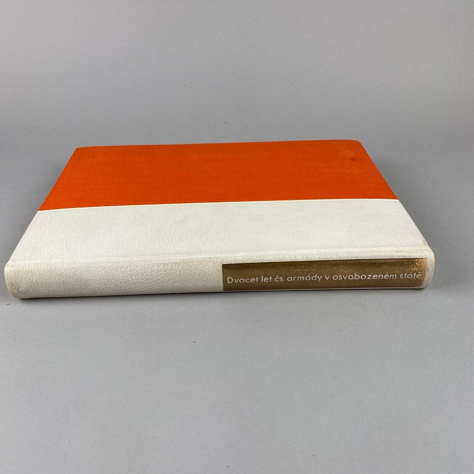 Good condition, hard cover, gold colored rectangular shaped frame on its spine shows light wear, binding is a bit loose with a tear along the first page. 20 Let Ceskoslovenske armady v osvobozenem state