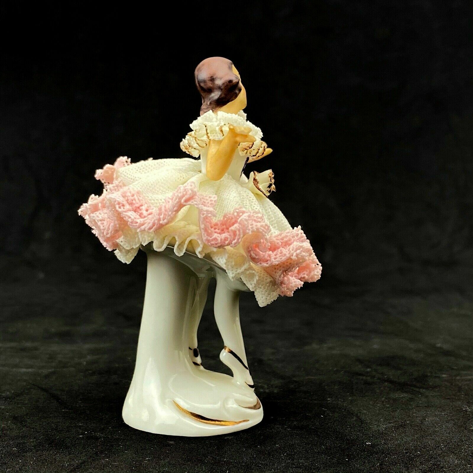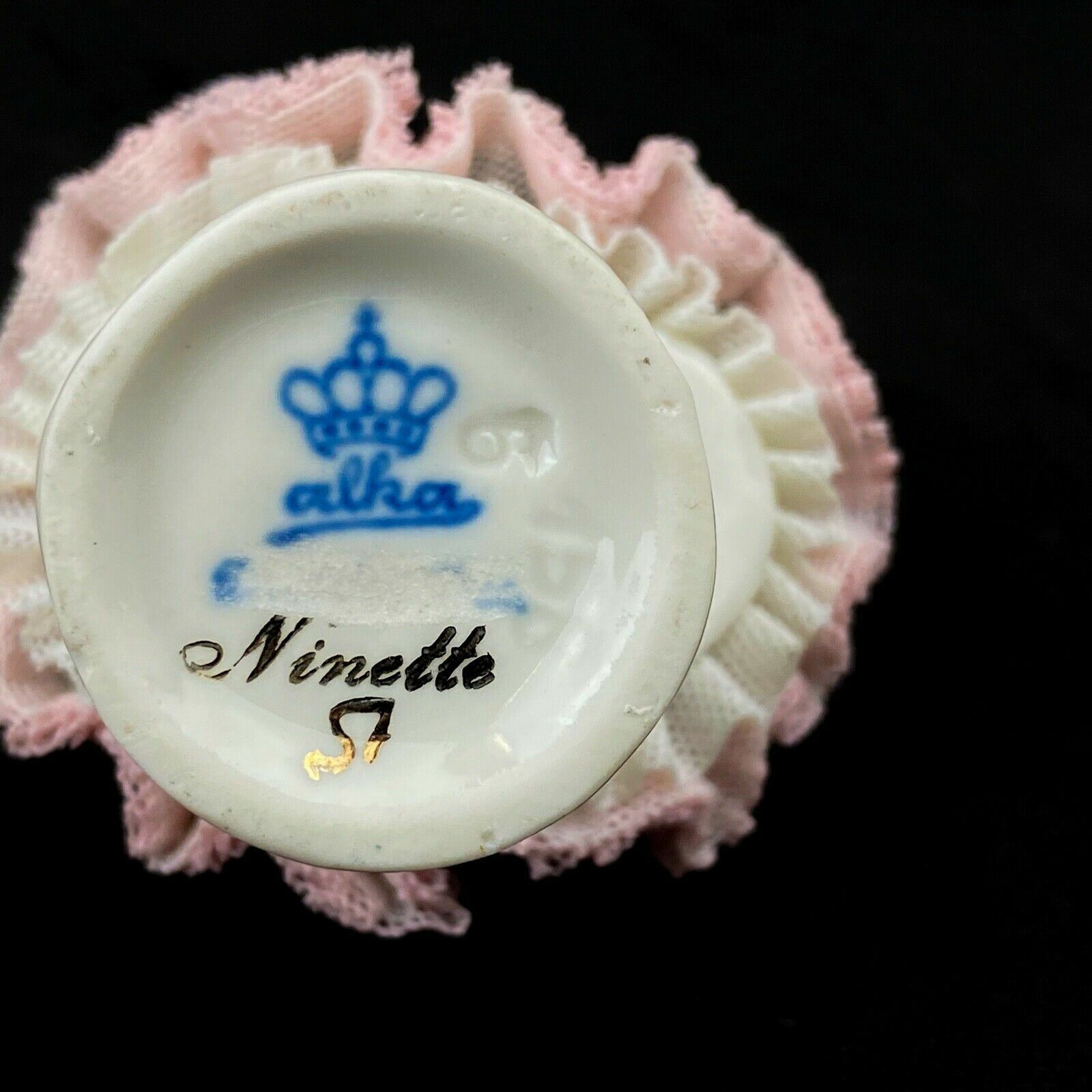 This Alka 'Ninette' German Dresden Lace Porcelain Dancer stands at a height of 3.5" and is in good condition, as shown in the accompanying photos.