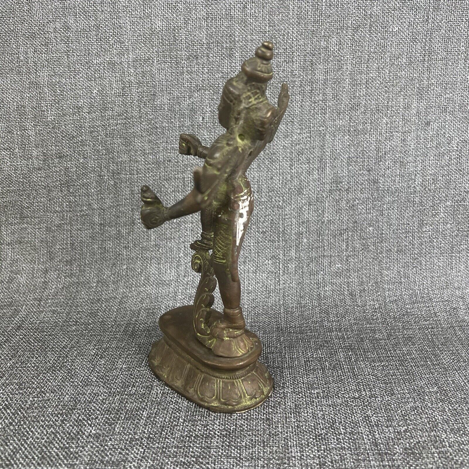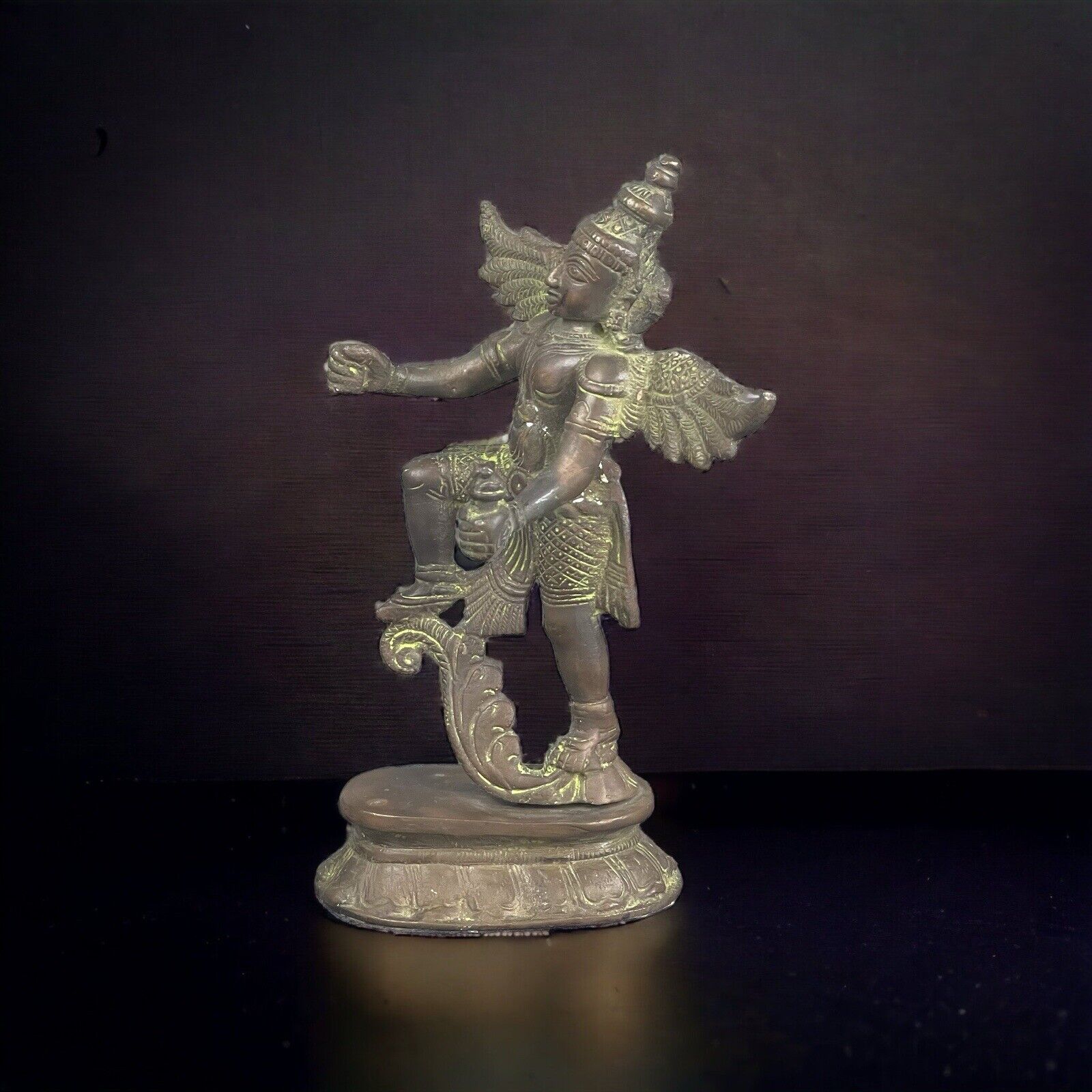 This antique vintage bronze statue of the Hindu deity Lord Vishnu with Garuda wings measures 7.5 inches in height and features intricate detailing. Please note that there may be a missing snake and the statue may need some polishing, as shown in the accompanying pictures.