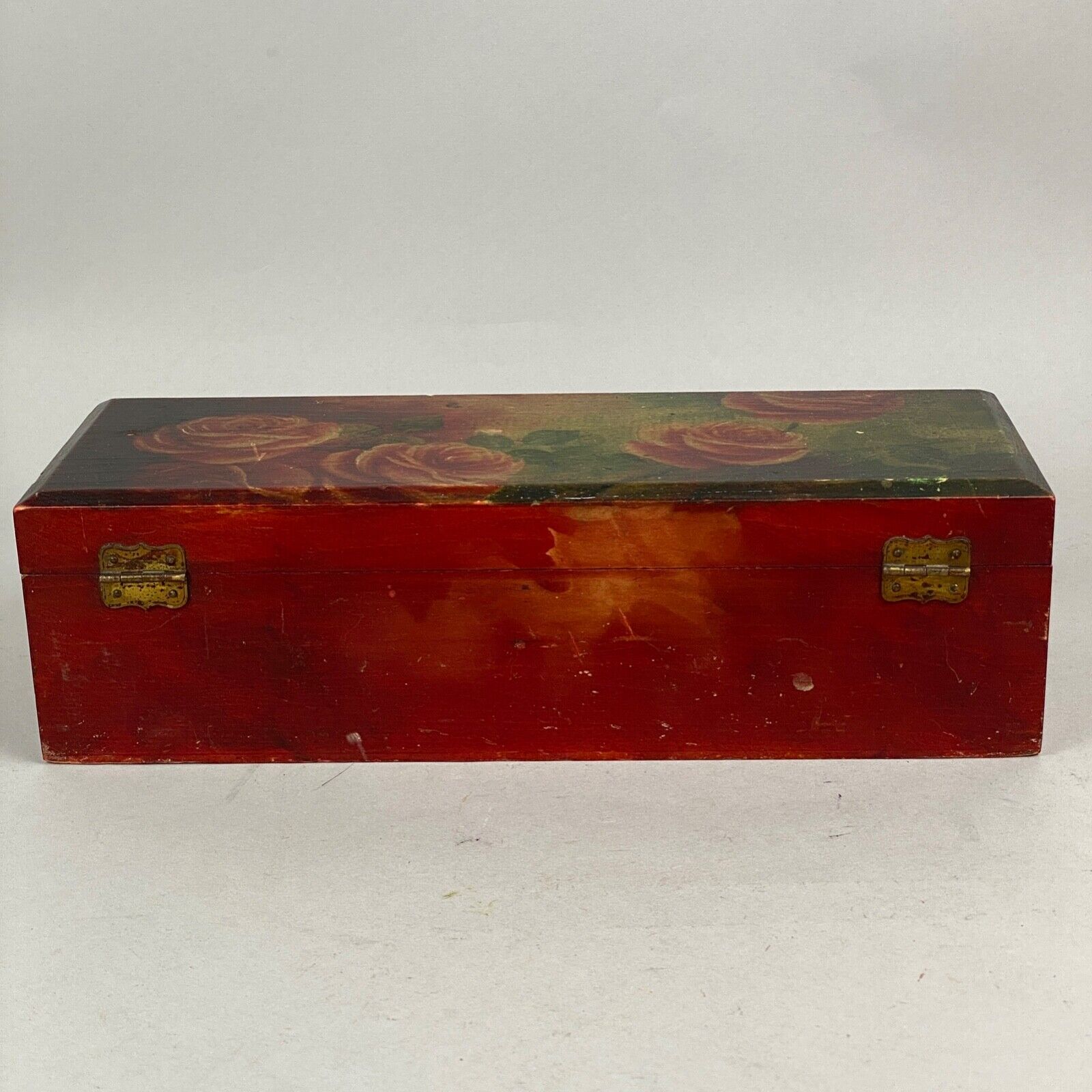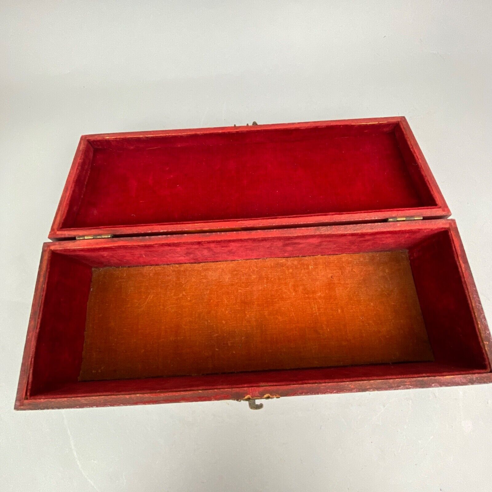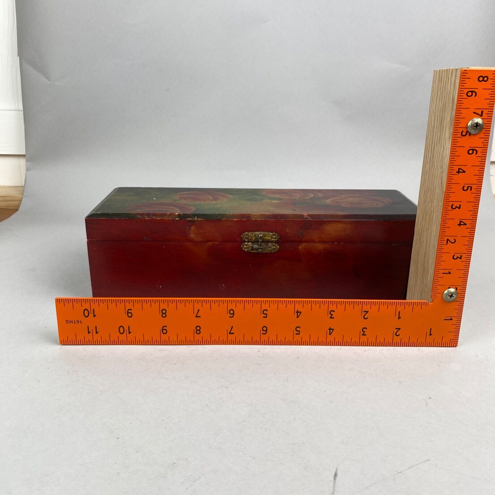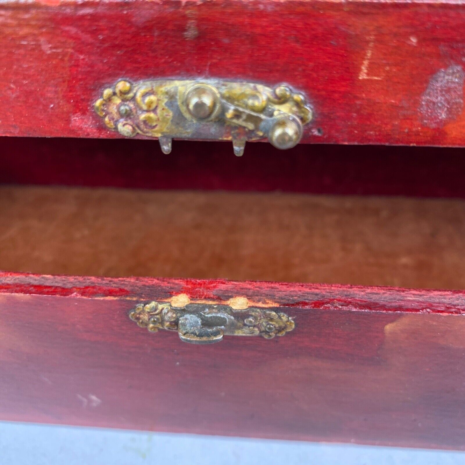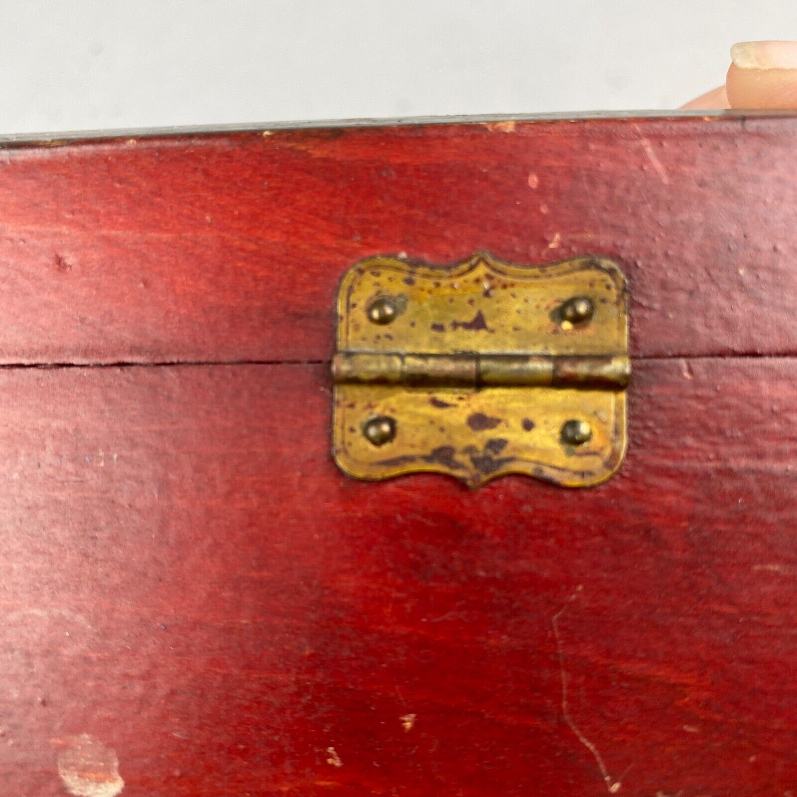 Antique Wood Hinged Jewelry Trinket Storage Letter Chest Hardware Red Paint