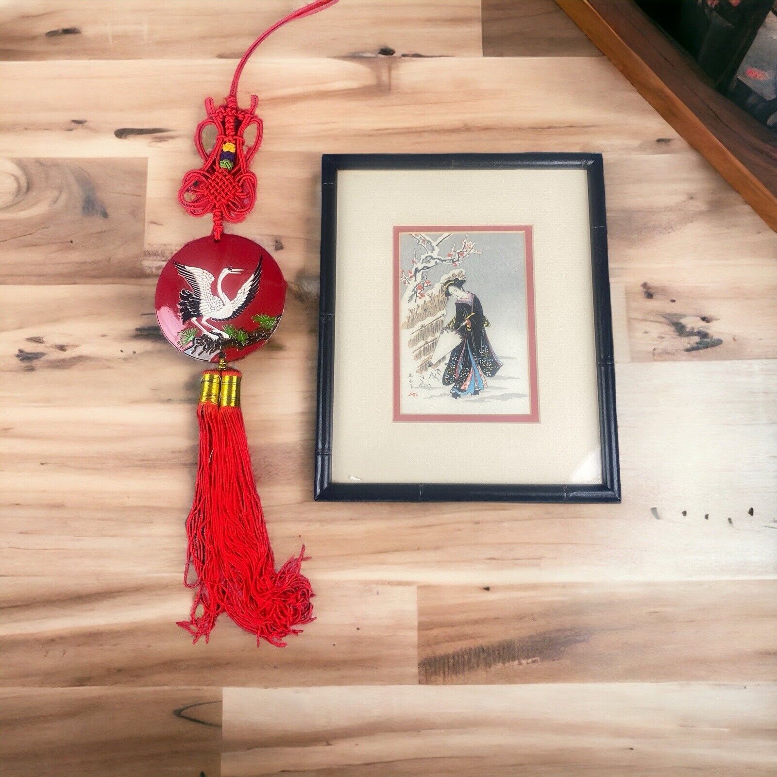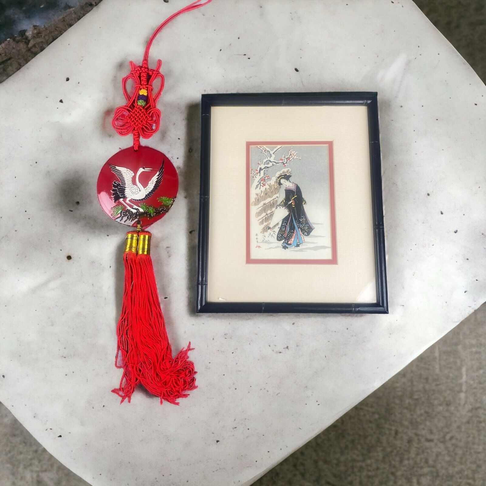Asian Black Lacquer Decor Bird, Framed Art 11" x 9" Lady in Snow