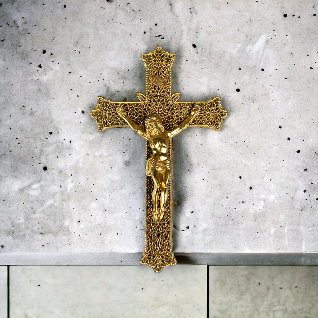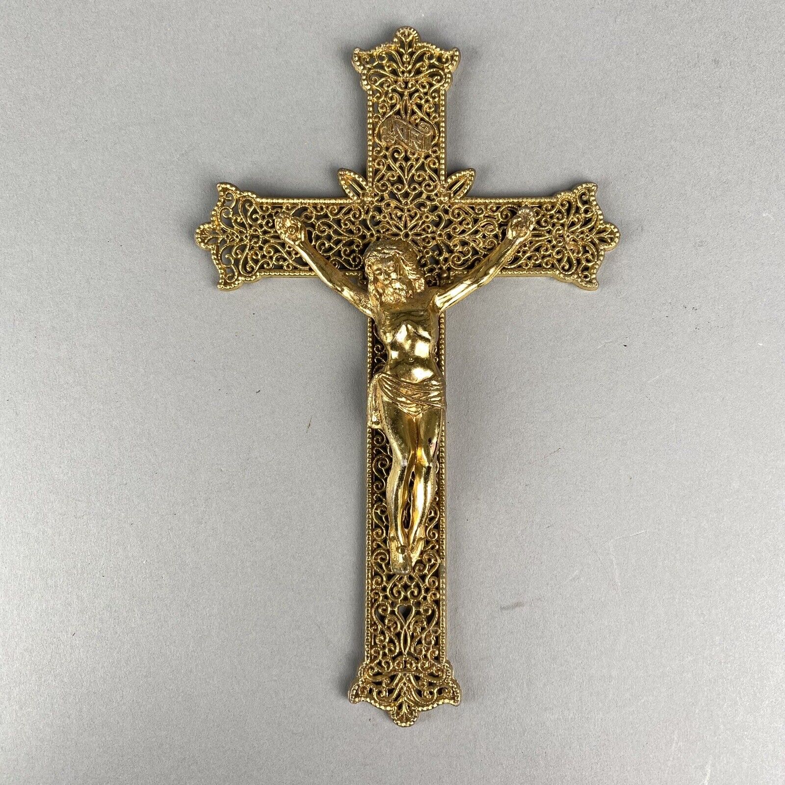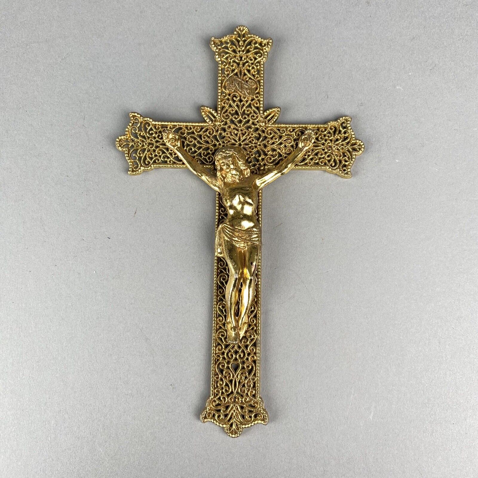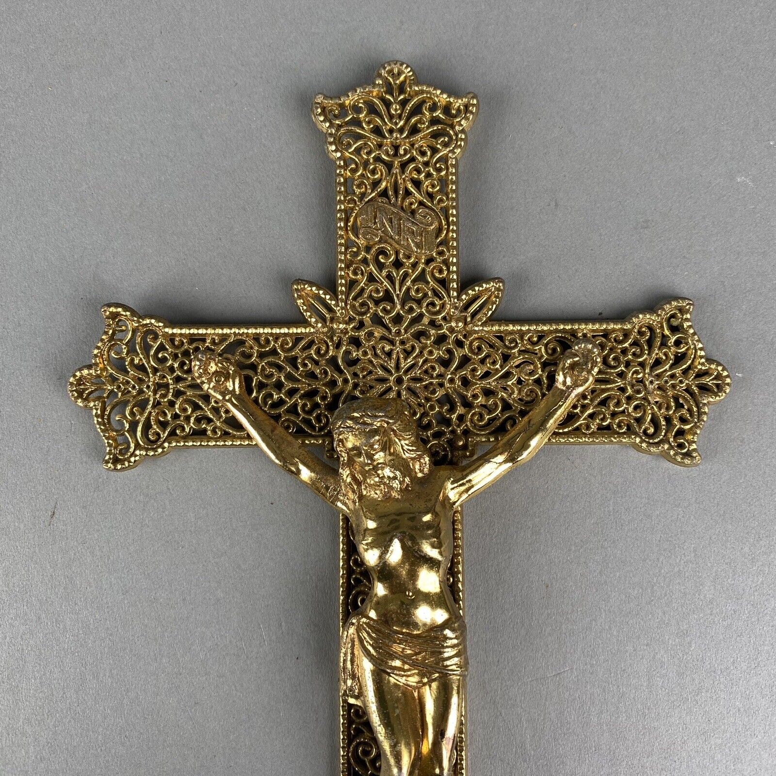 Crucifix Jesus Catholic Cross INRISolid Brass Gold-Tone Filigree Wall Decor 9”
