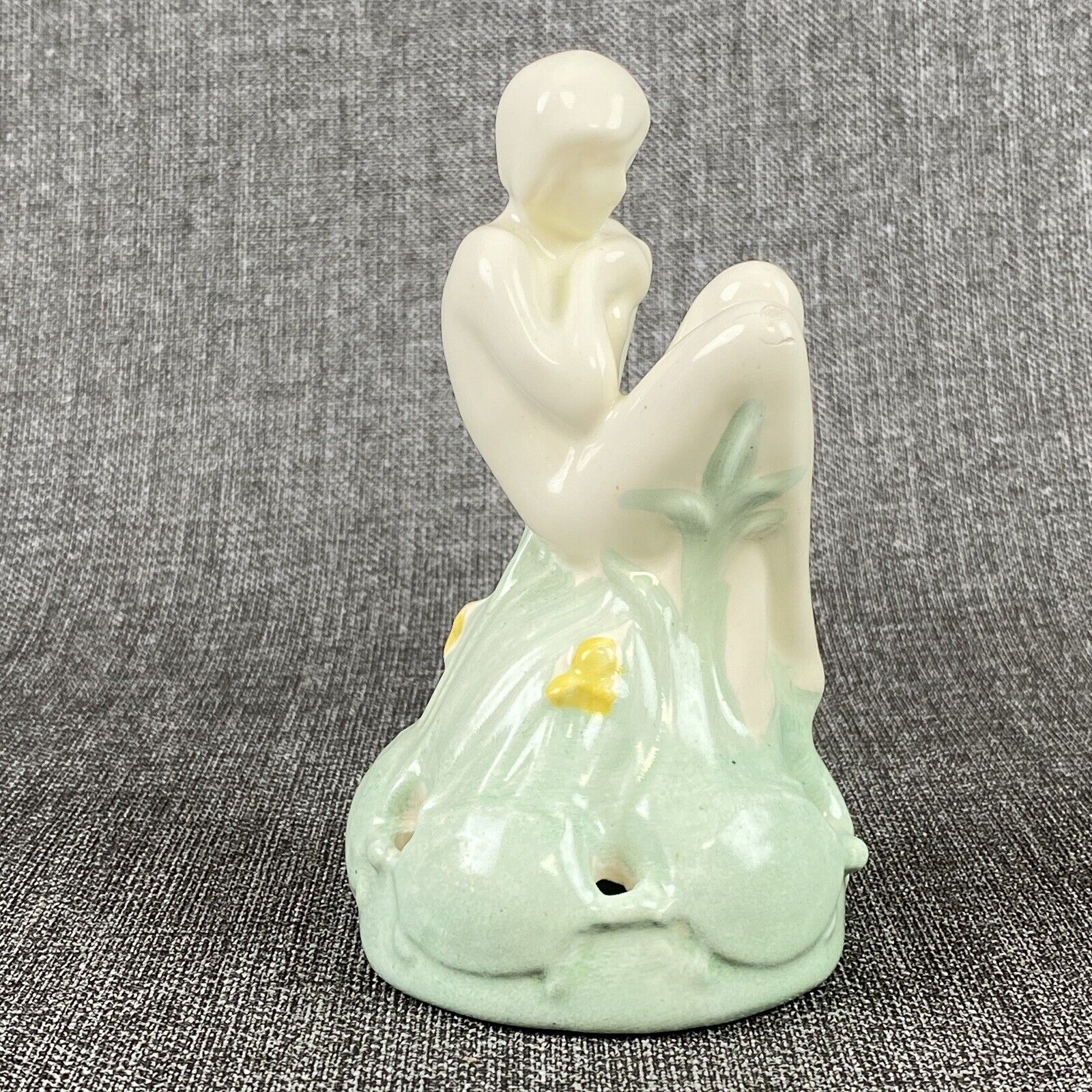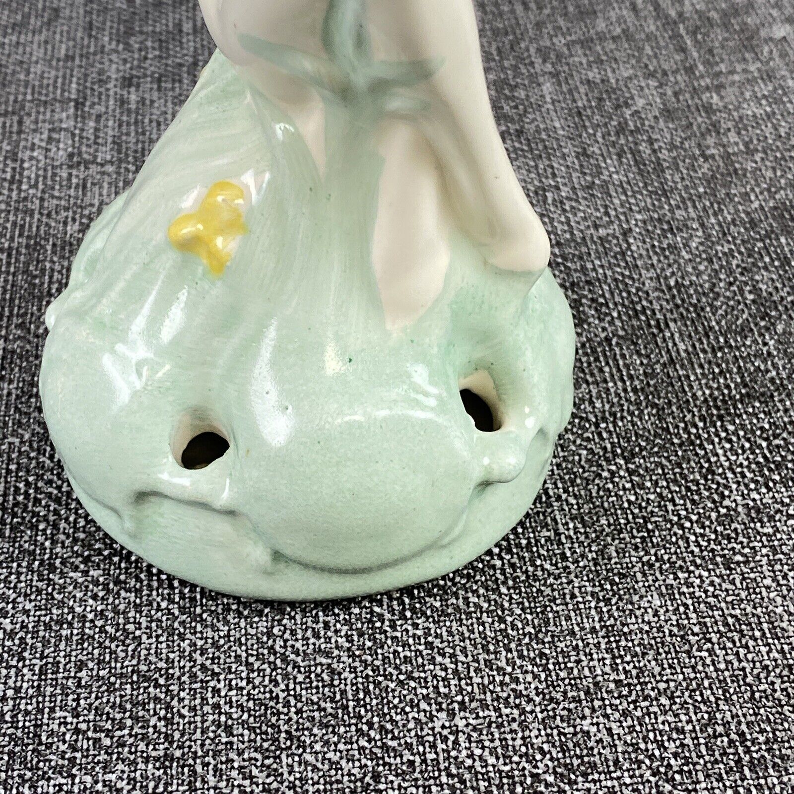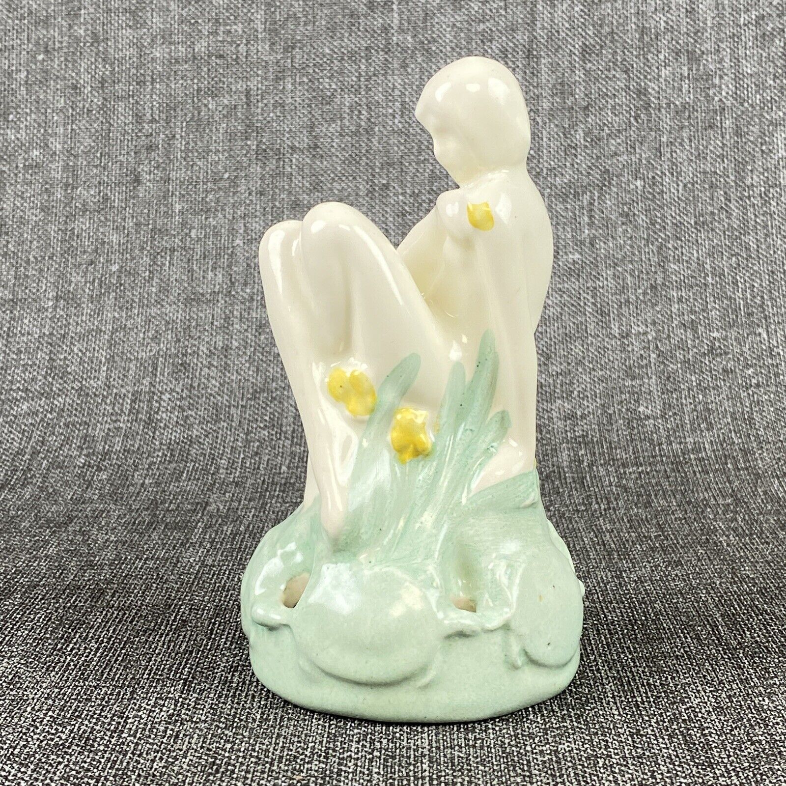 Crafted during the dawn of artistry, this Fulper Nymph Flower Frog figurine is a testament to early 20th-century craftsmanship. It features a charming portrayal of a nymph amidst a floral motif, complete with delicate turtledoves adding a touch of tranquility to its scene. Made of porcelain, this piece stands at a modest 5.5 inches tall, making it a subtle yet elegant addition to any collection. Proudly originating from the United States, this authentic Fulper creation is a cherished original from the year c1915. As a small yet significant work of art, it comes signed by the maker, ensuring its provenance and adding to its collectible value. Condition: Small scratch chip on the knee. Please see photos and let me know if you have any questions.