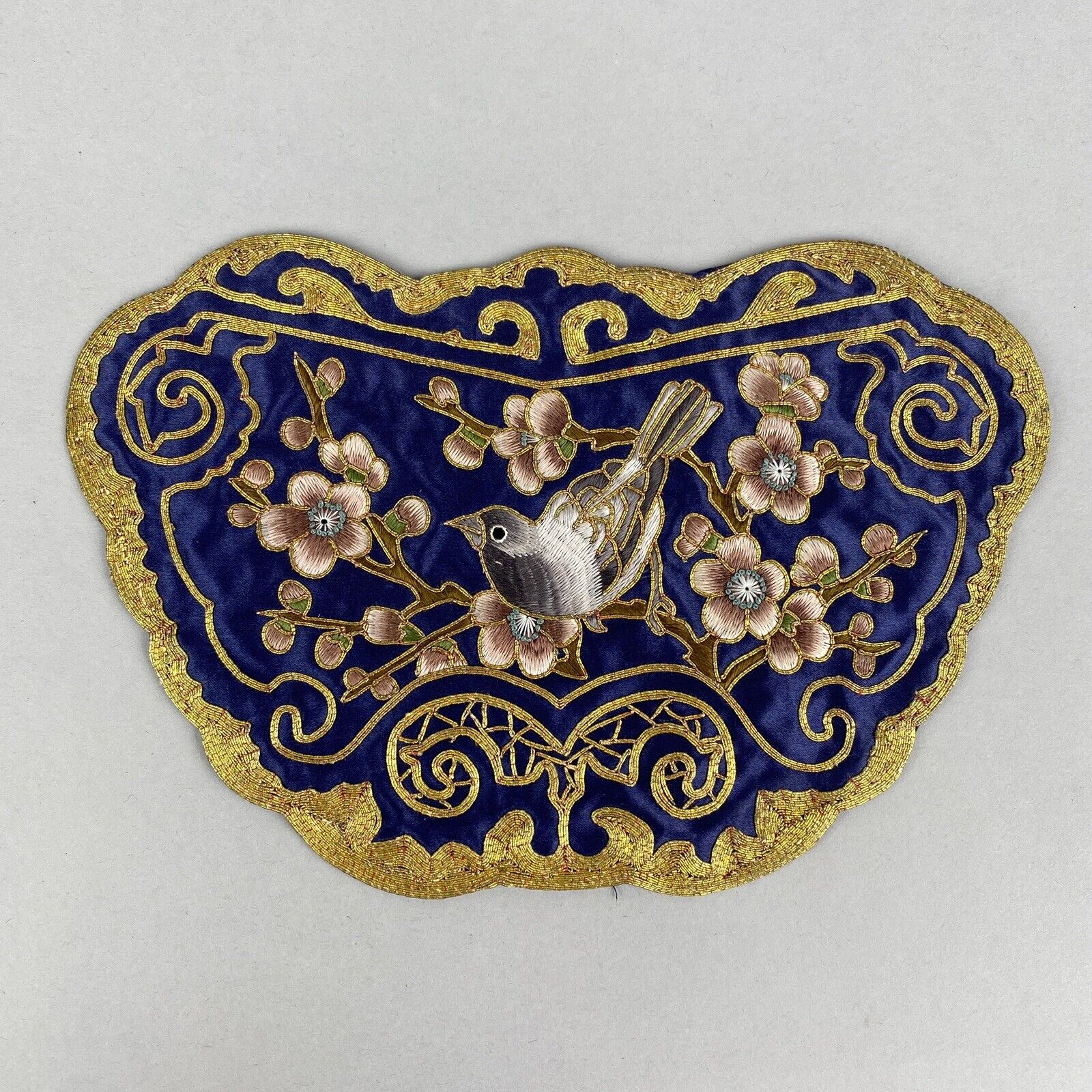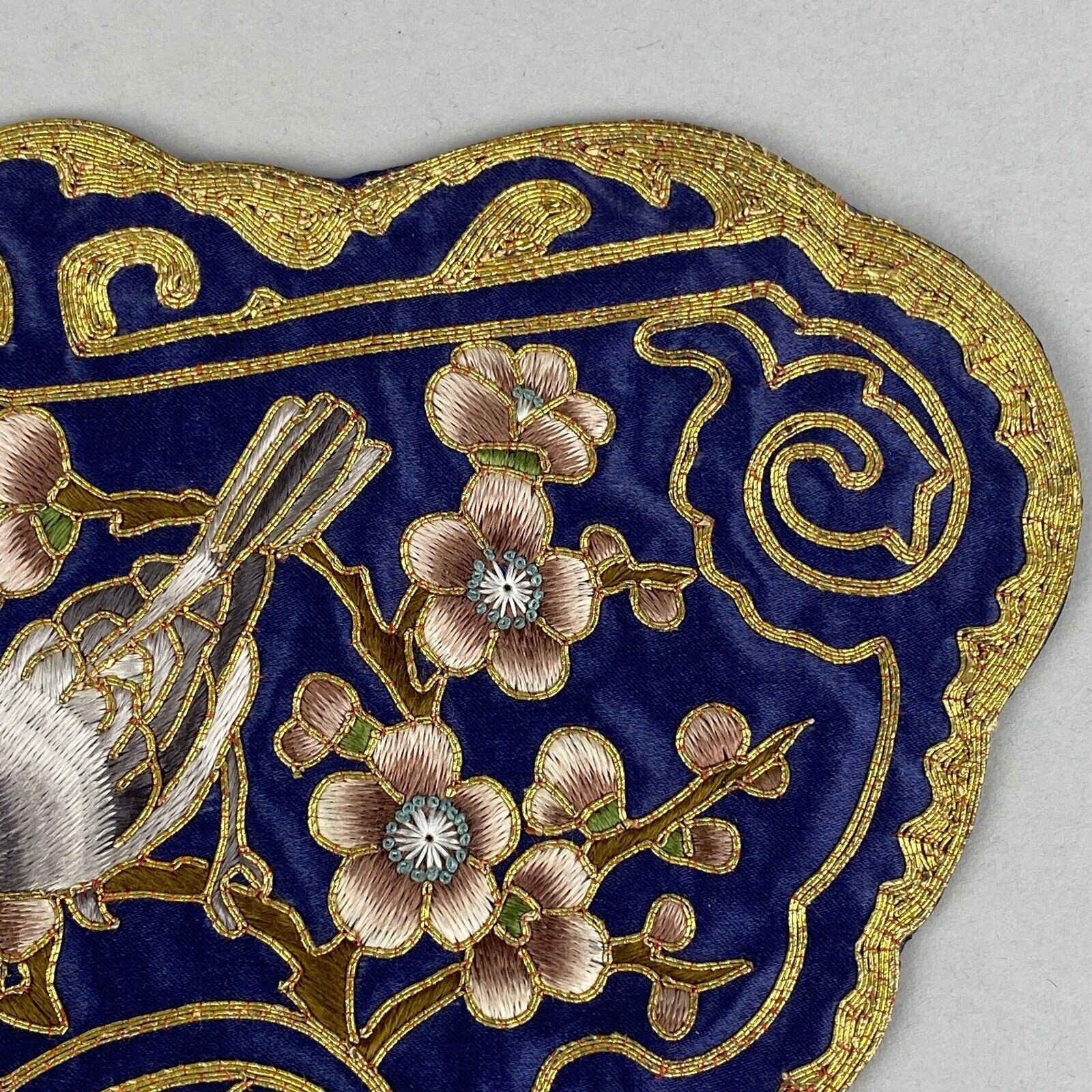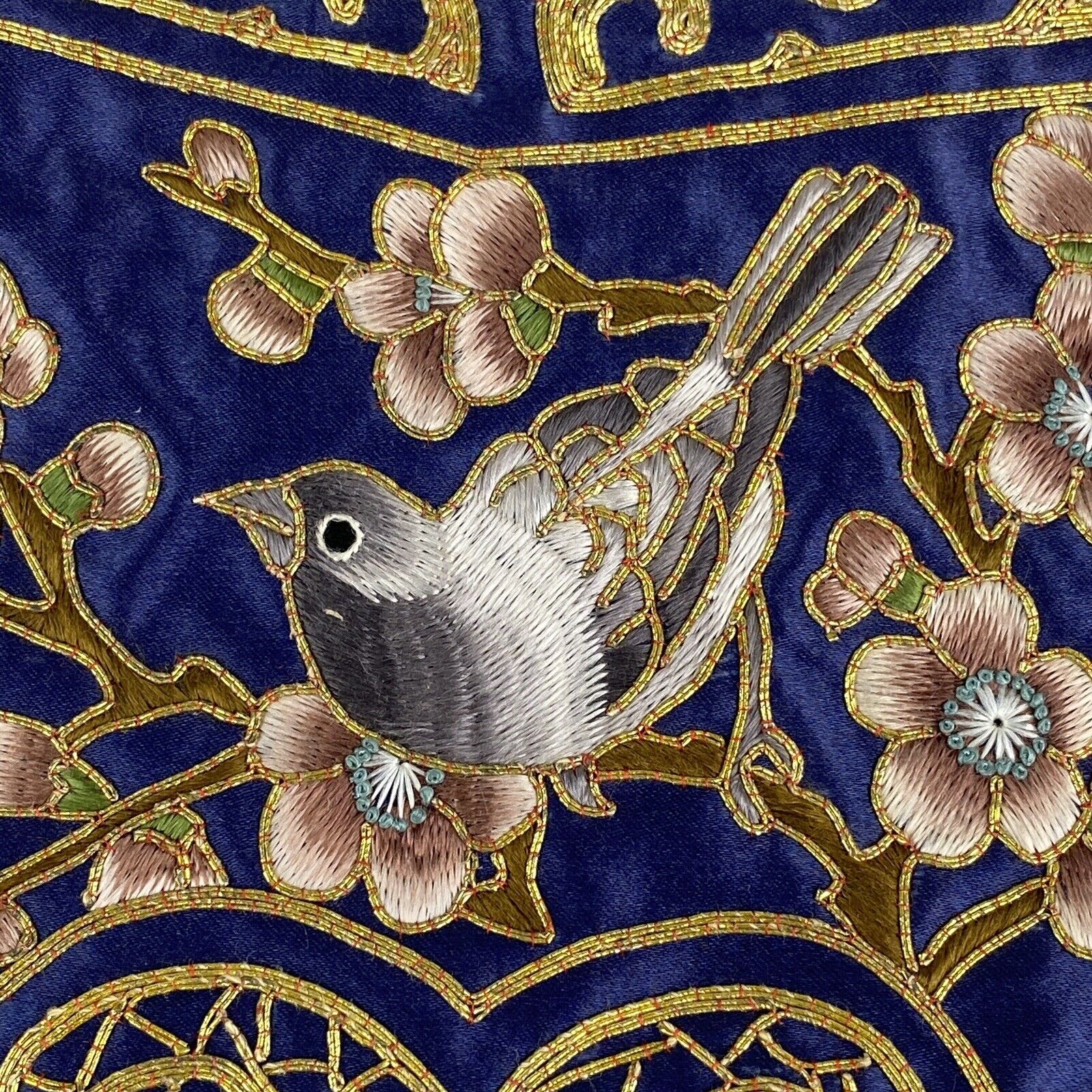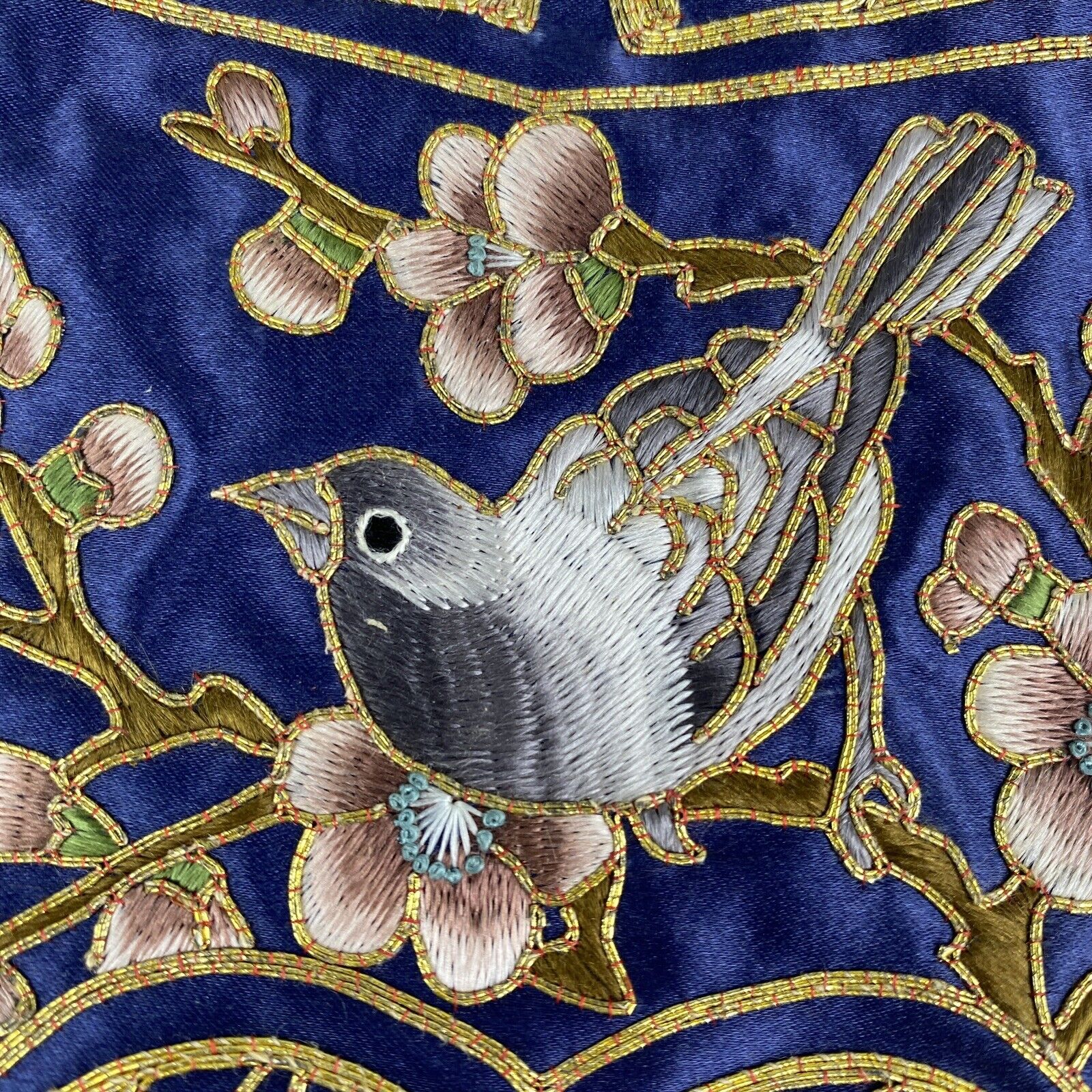 Hand Embroidered Silk Scalloped Blue Background with Bird (READ)