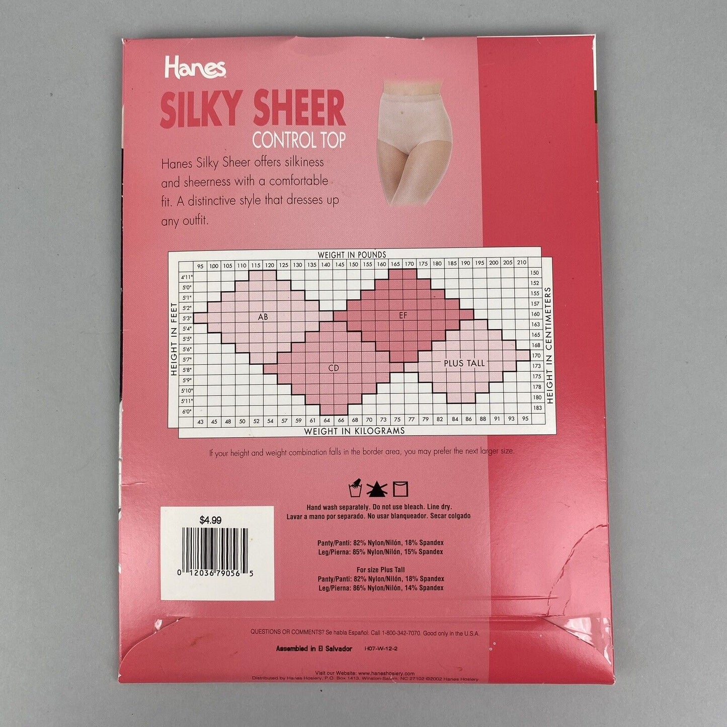 This is a pair of Hanes buff silky sheer, control top sandalfoot pantyhose in the style OG070 and size EF. They are new but the packaging may show wear due to their antiquity.