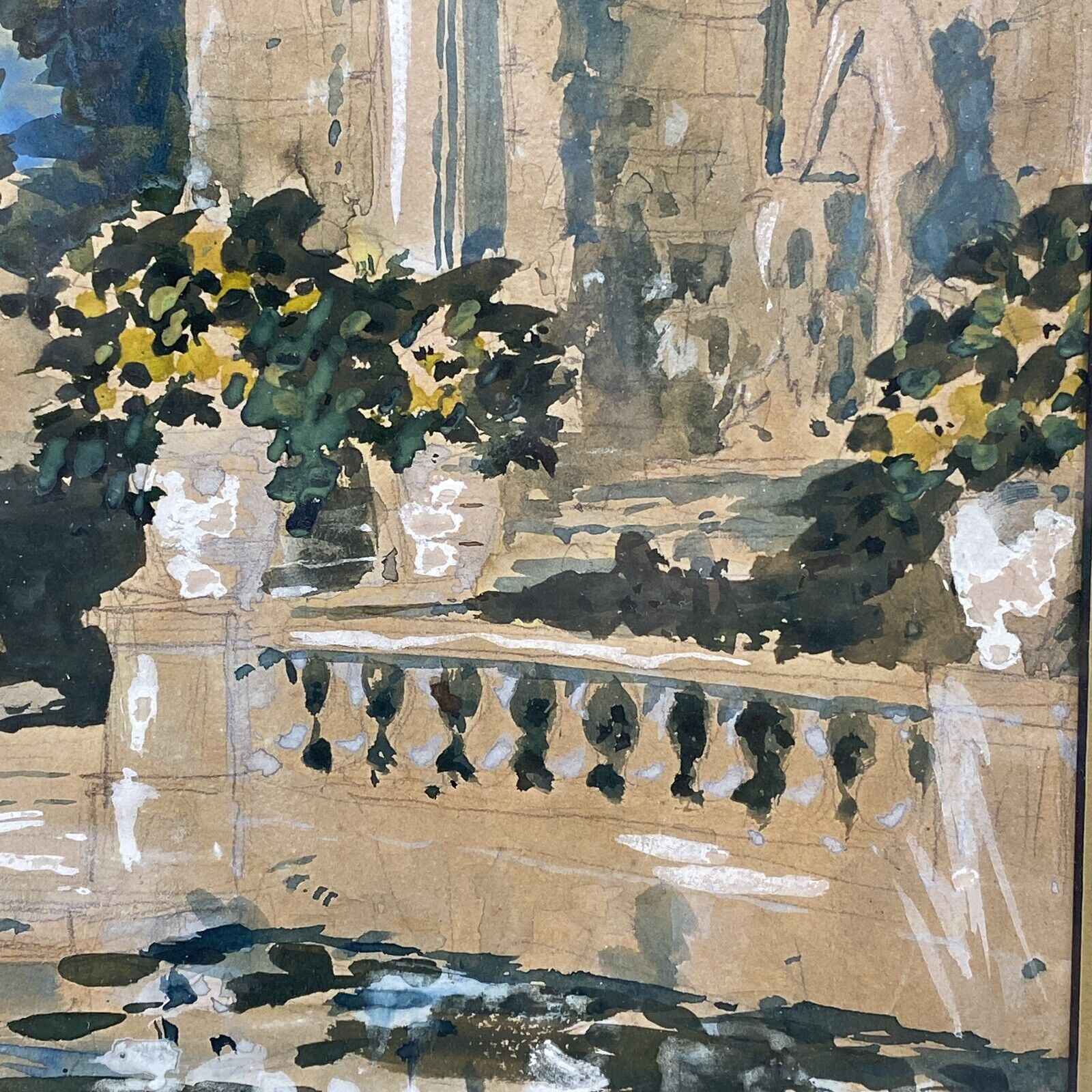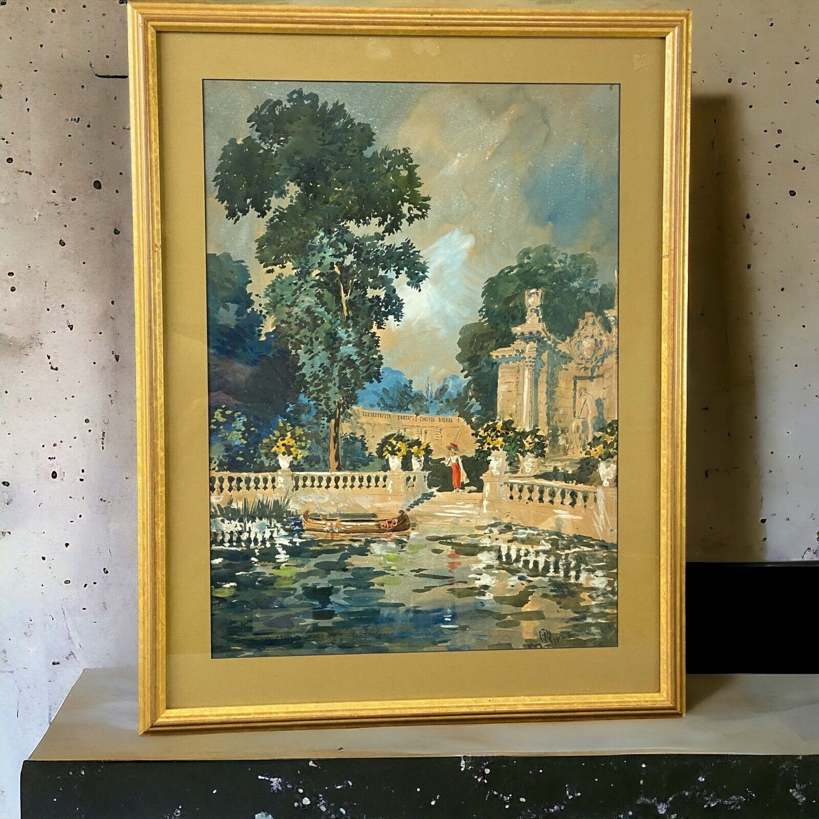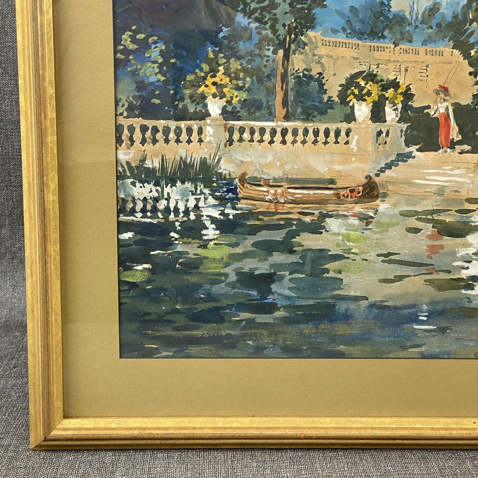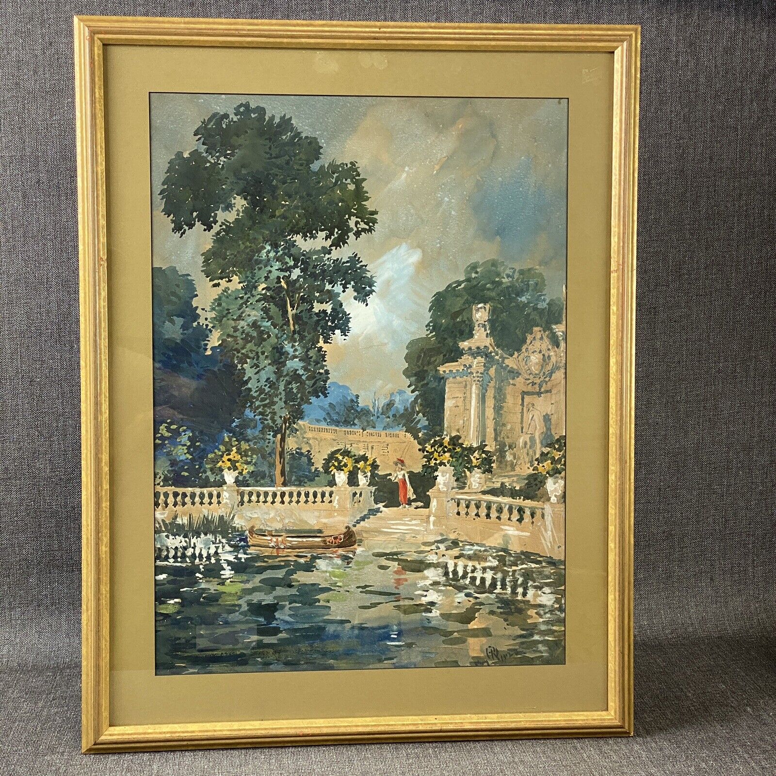 Herbert Ripley GARDEN SCENE Original Watercolor Painting Woman and Pond 28"x22"