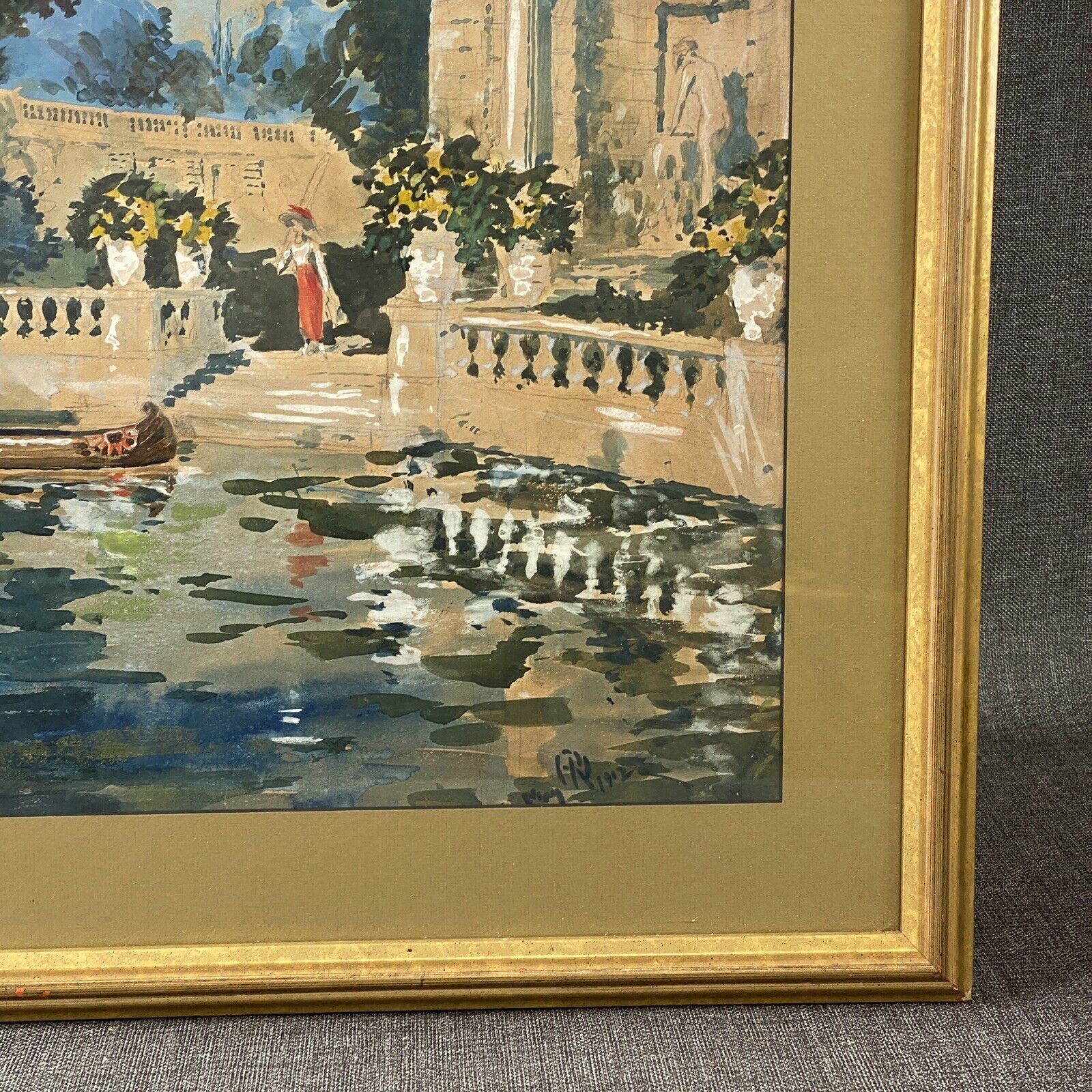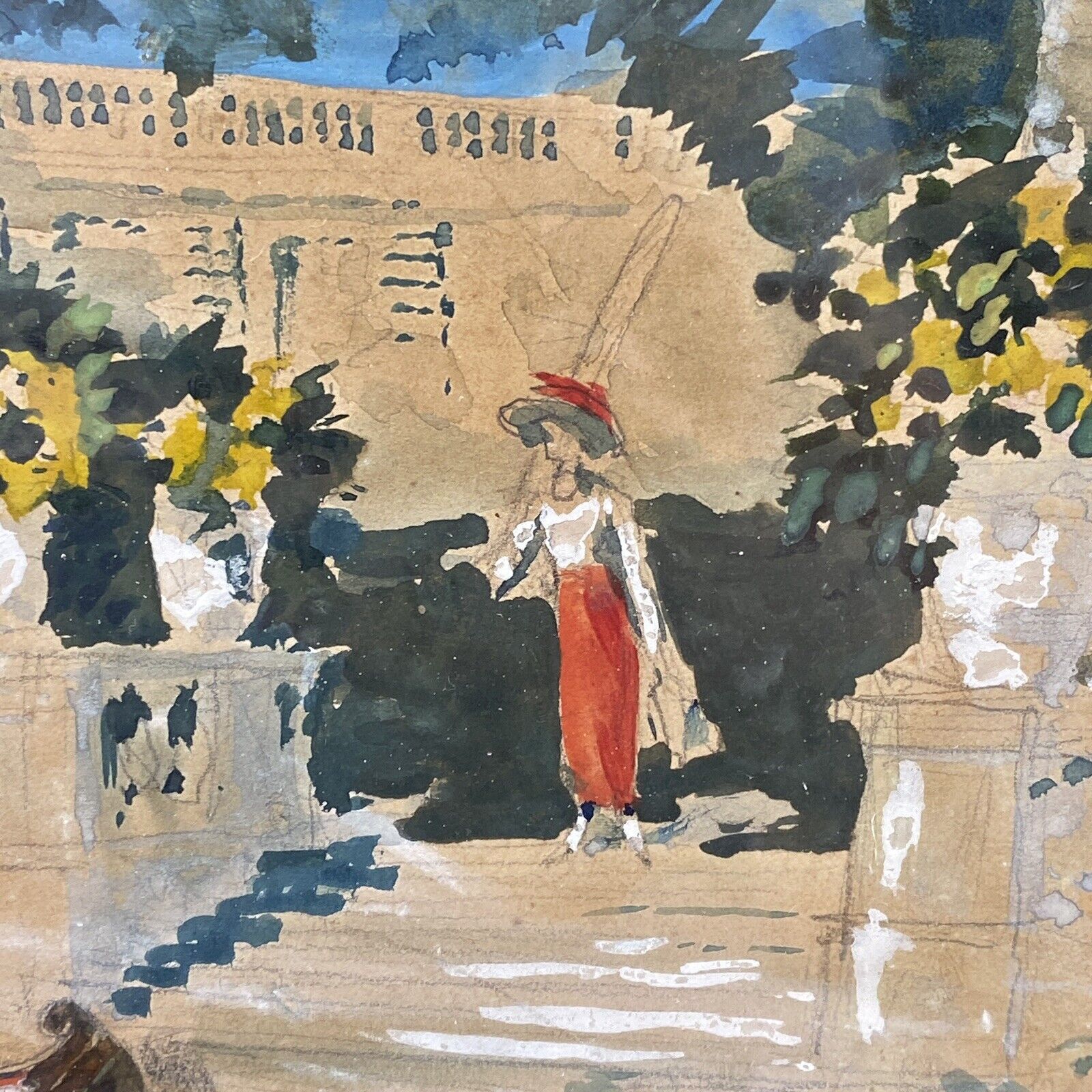 GARDEN SCENE gouache and watercolor, framed, signed & dated: HR, 1902