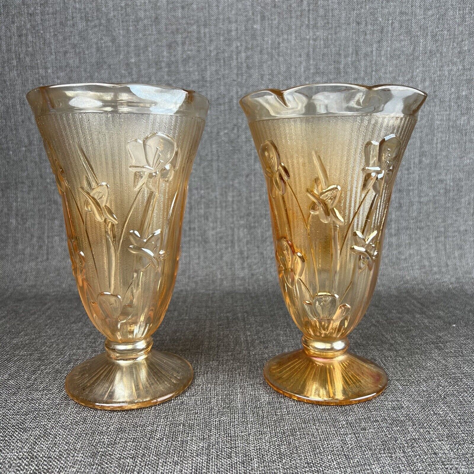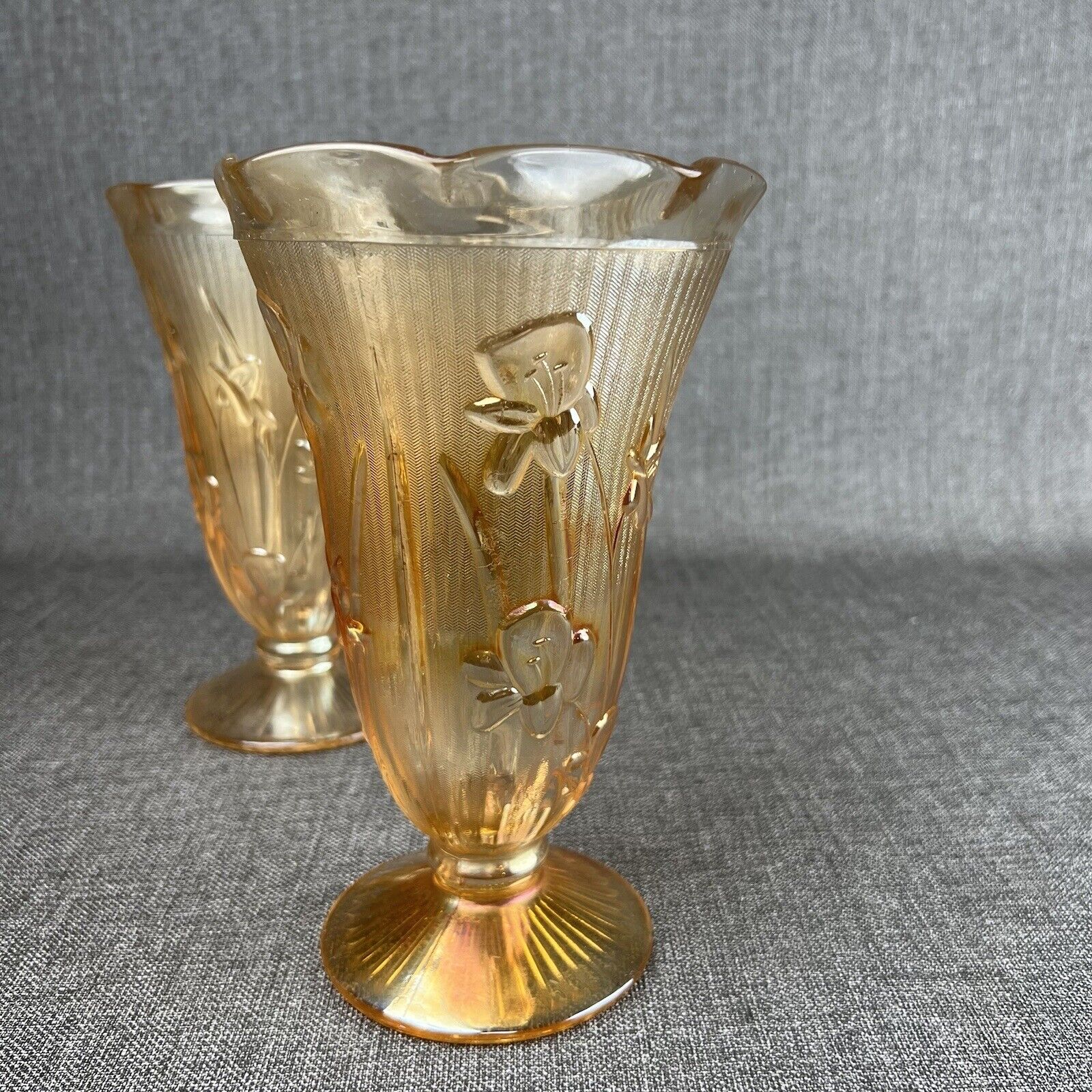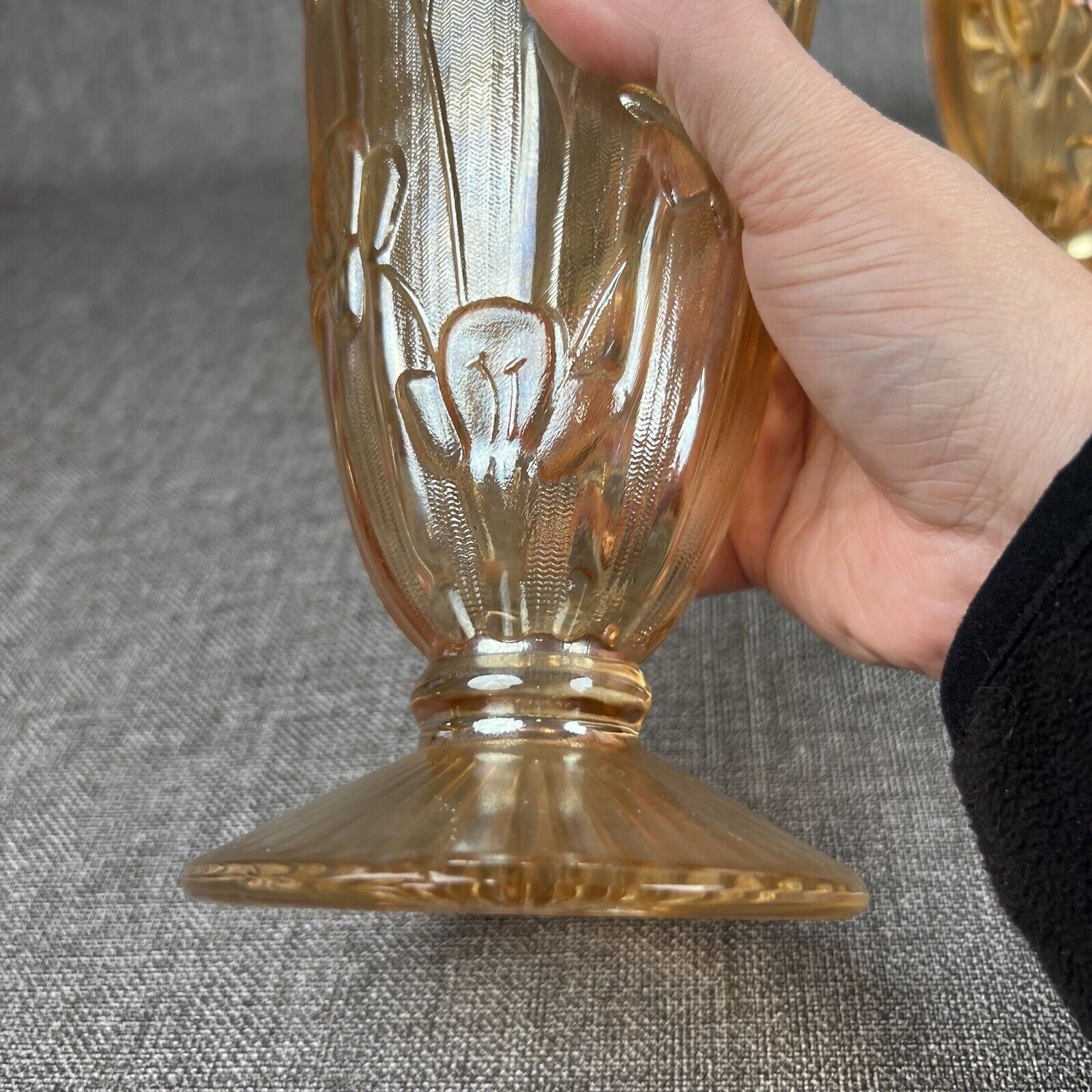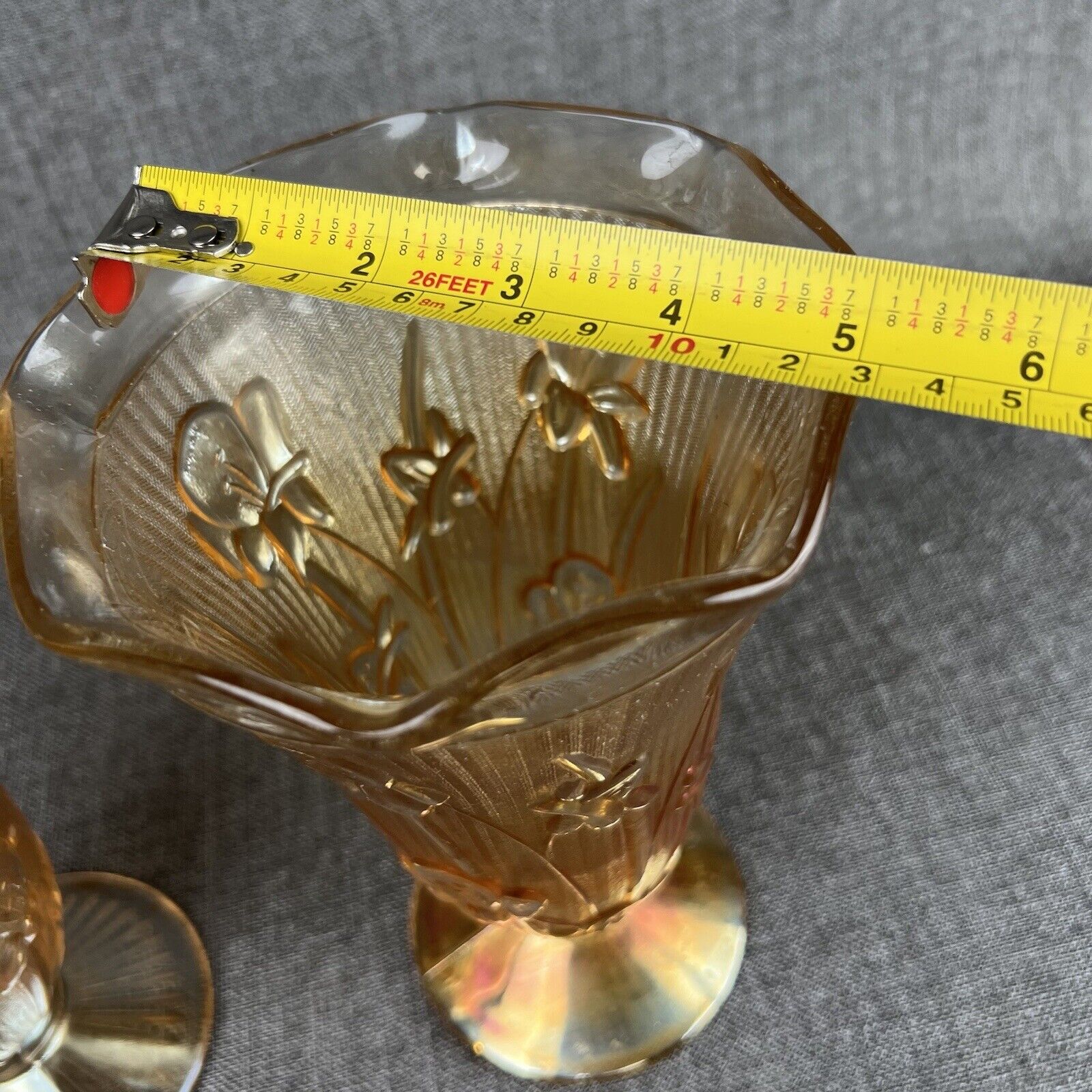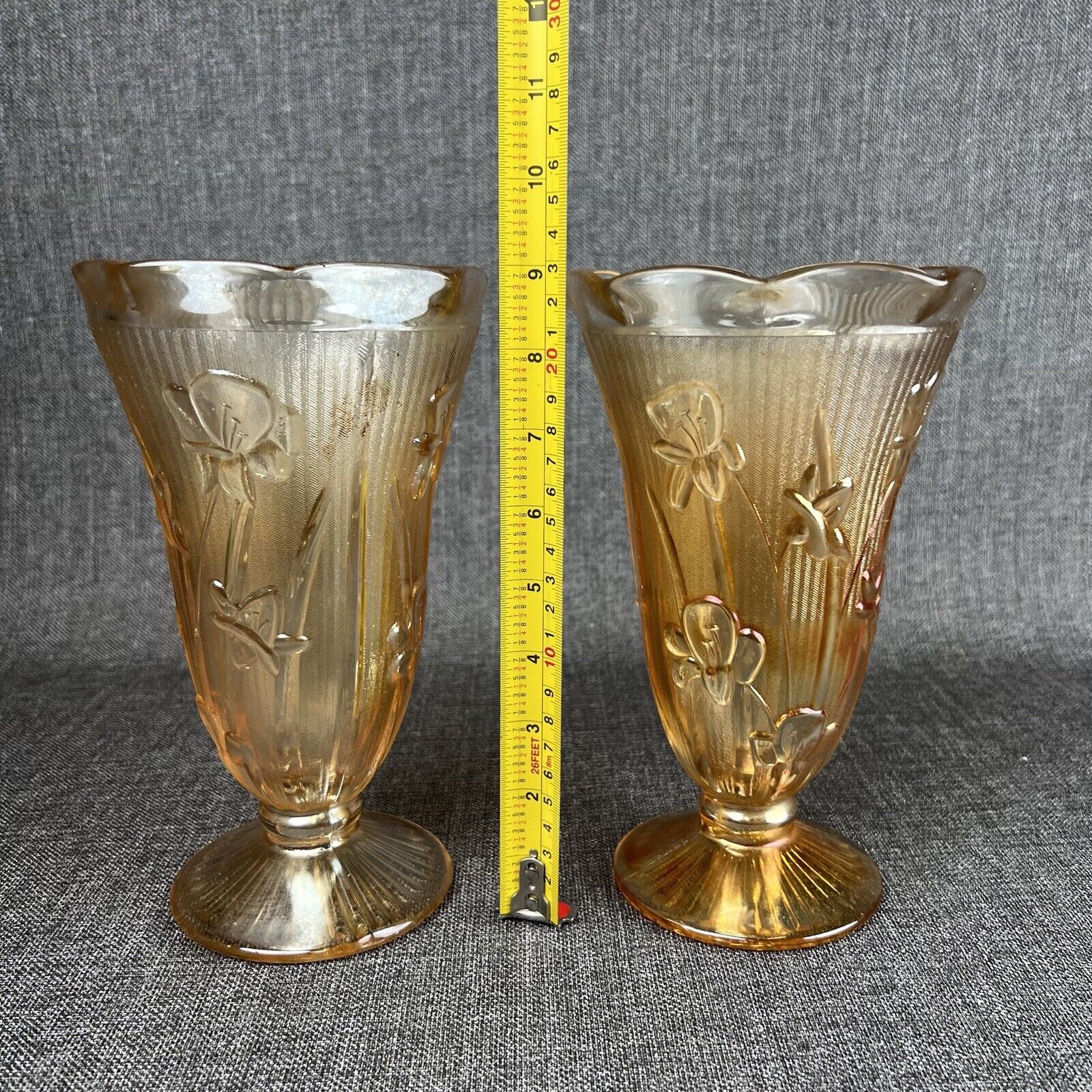 Jeanette Iridesent Carvinal Glass Marigold and Herringbone pair Vases 9" tall