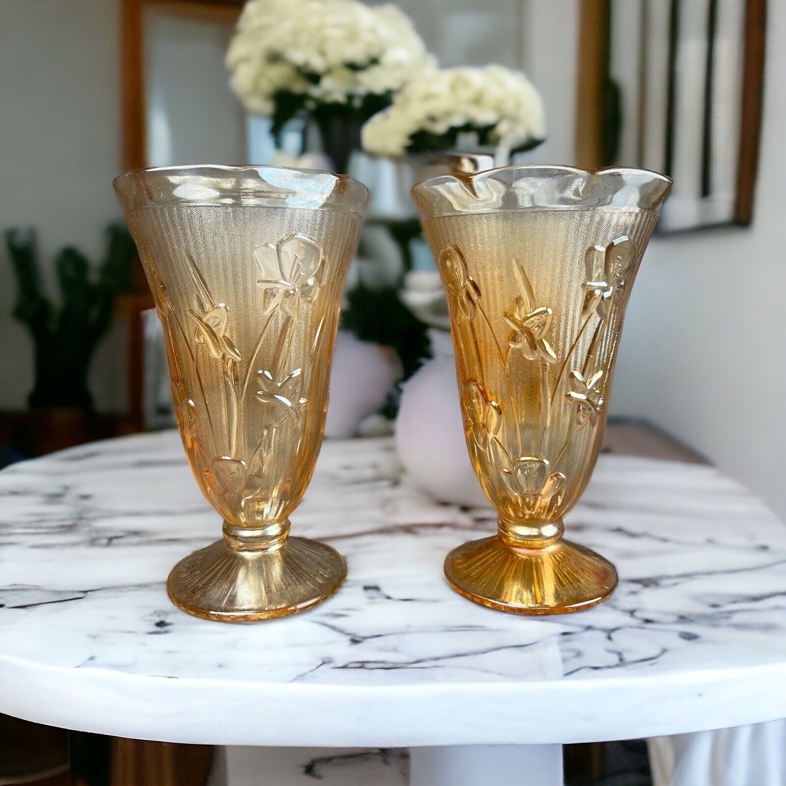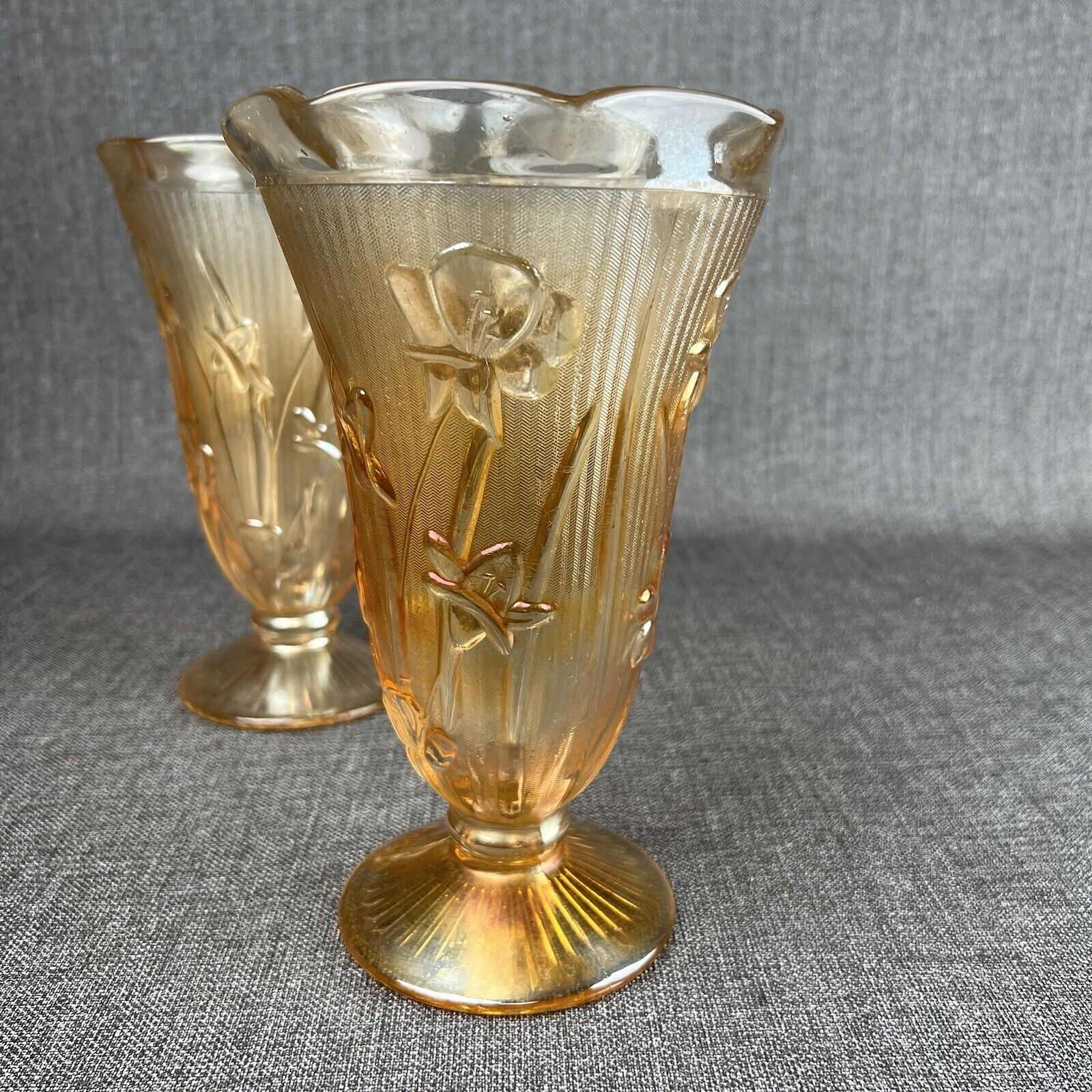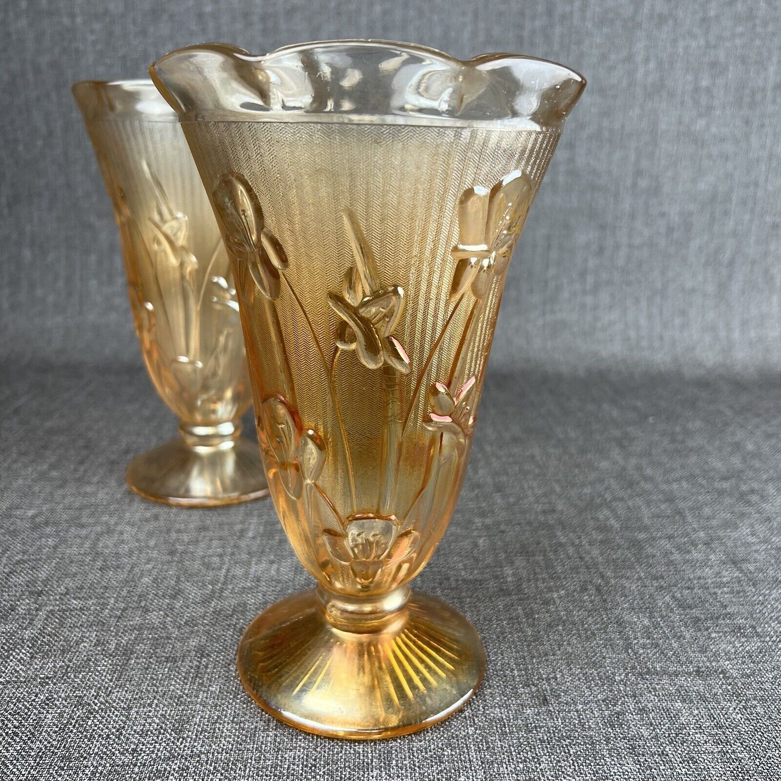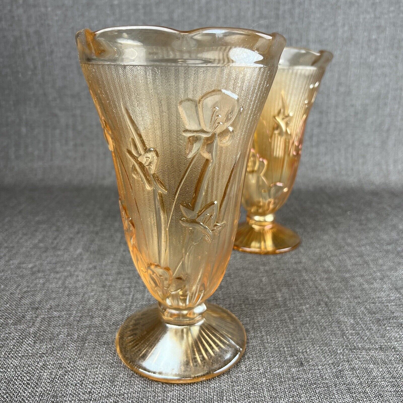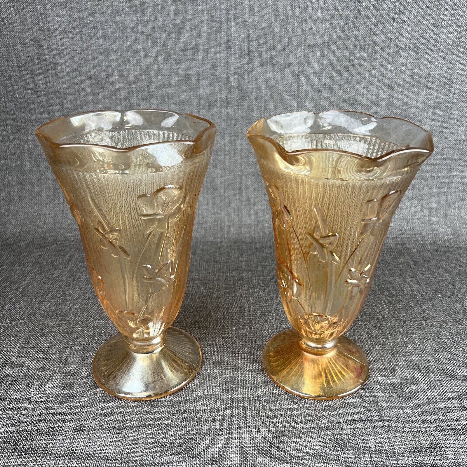 Jeanette Iridesent Carvinal Glass Marigold and Herringbone pair Vases 9" tall