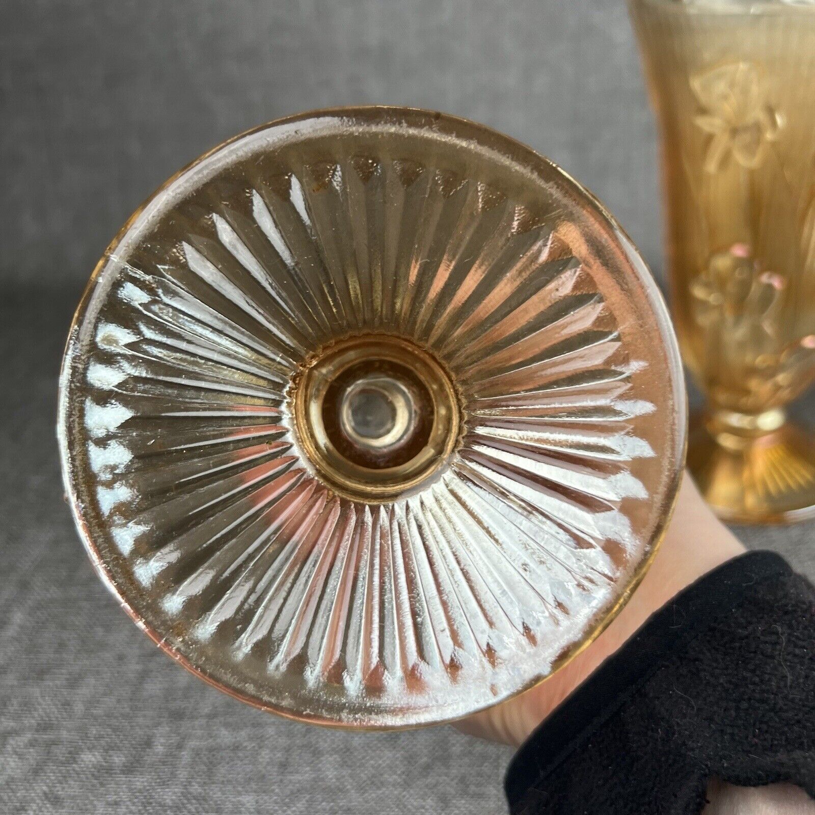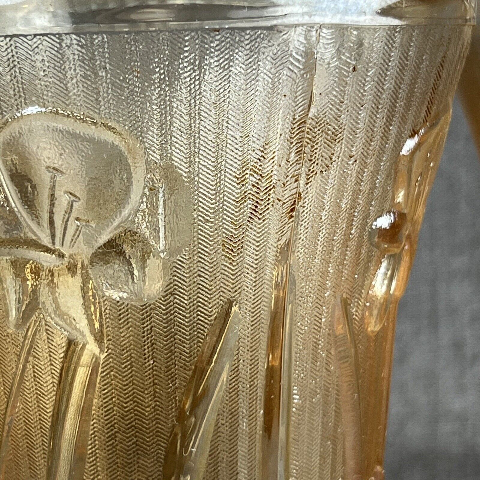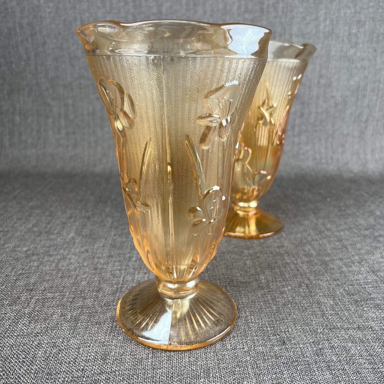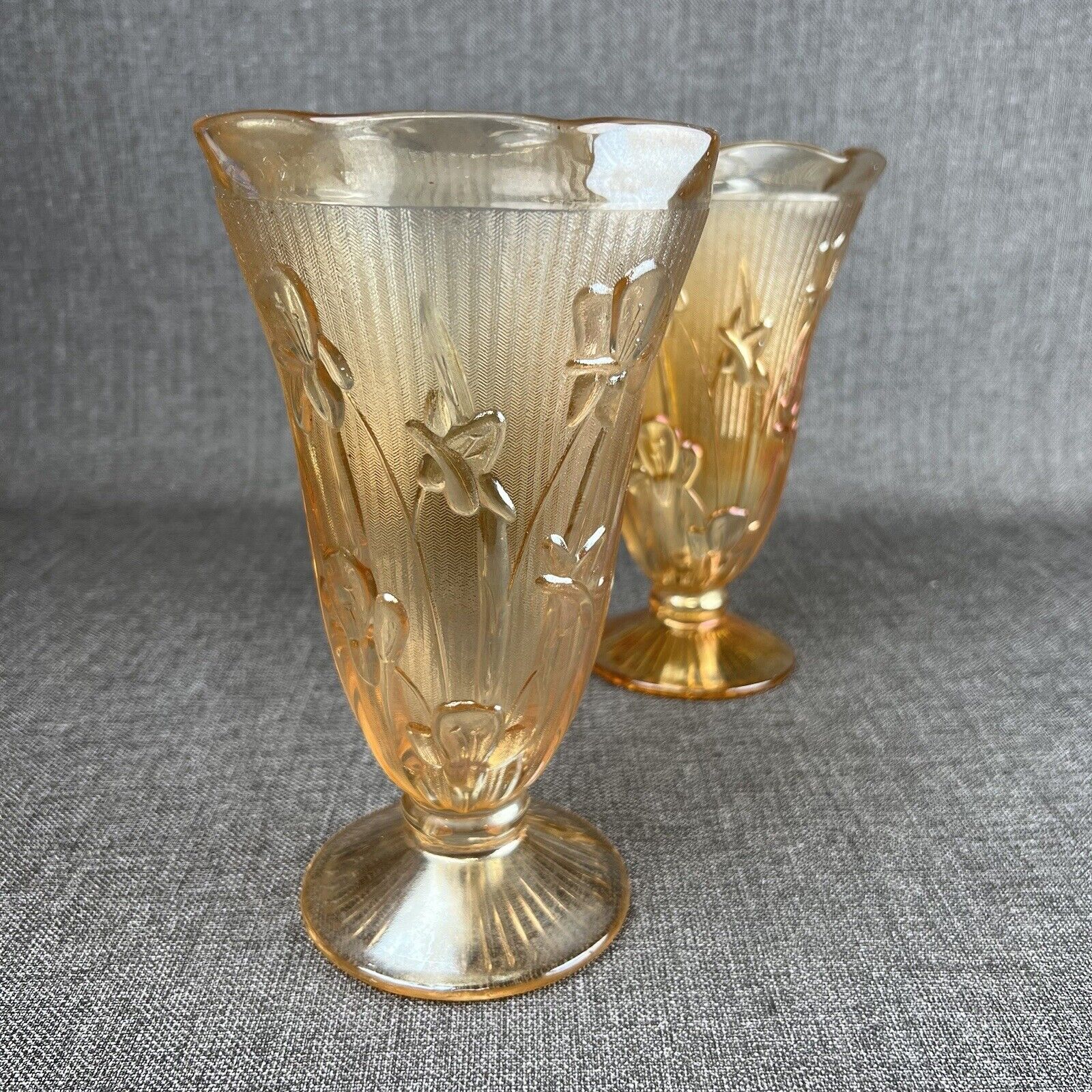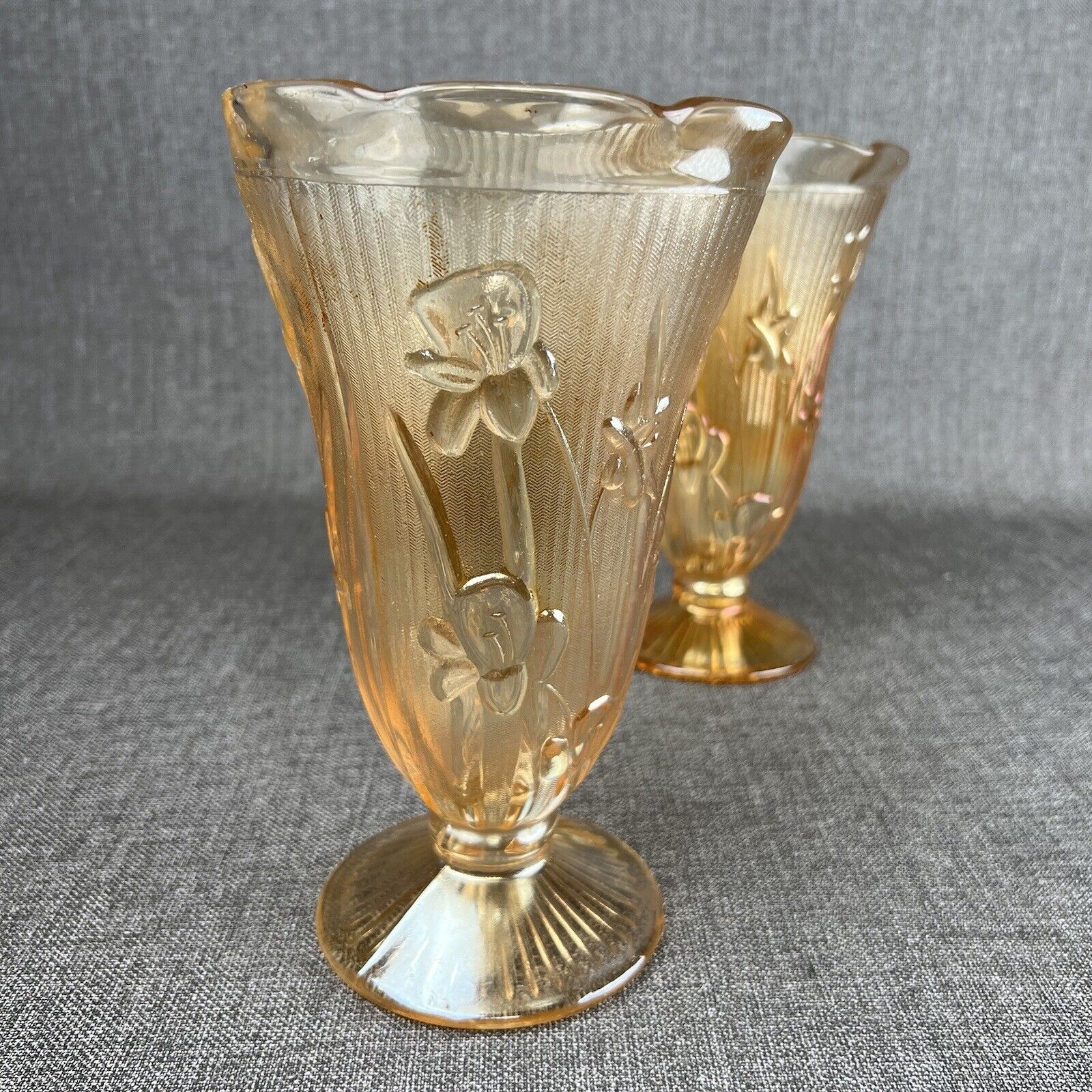 Jeanette Iridesent Carvinal Glass Marigold and Herringbone pair Vases 9" tall
