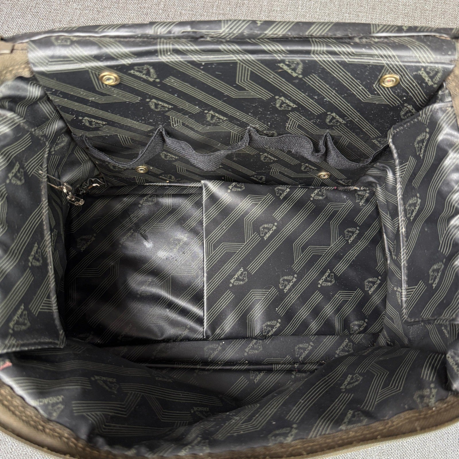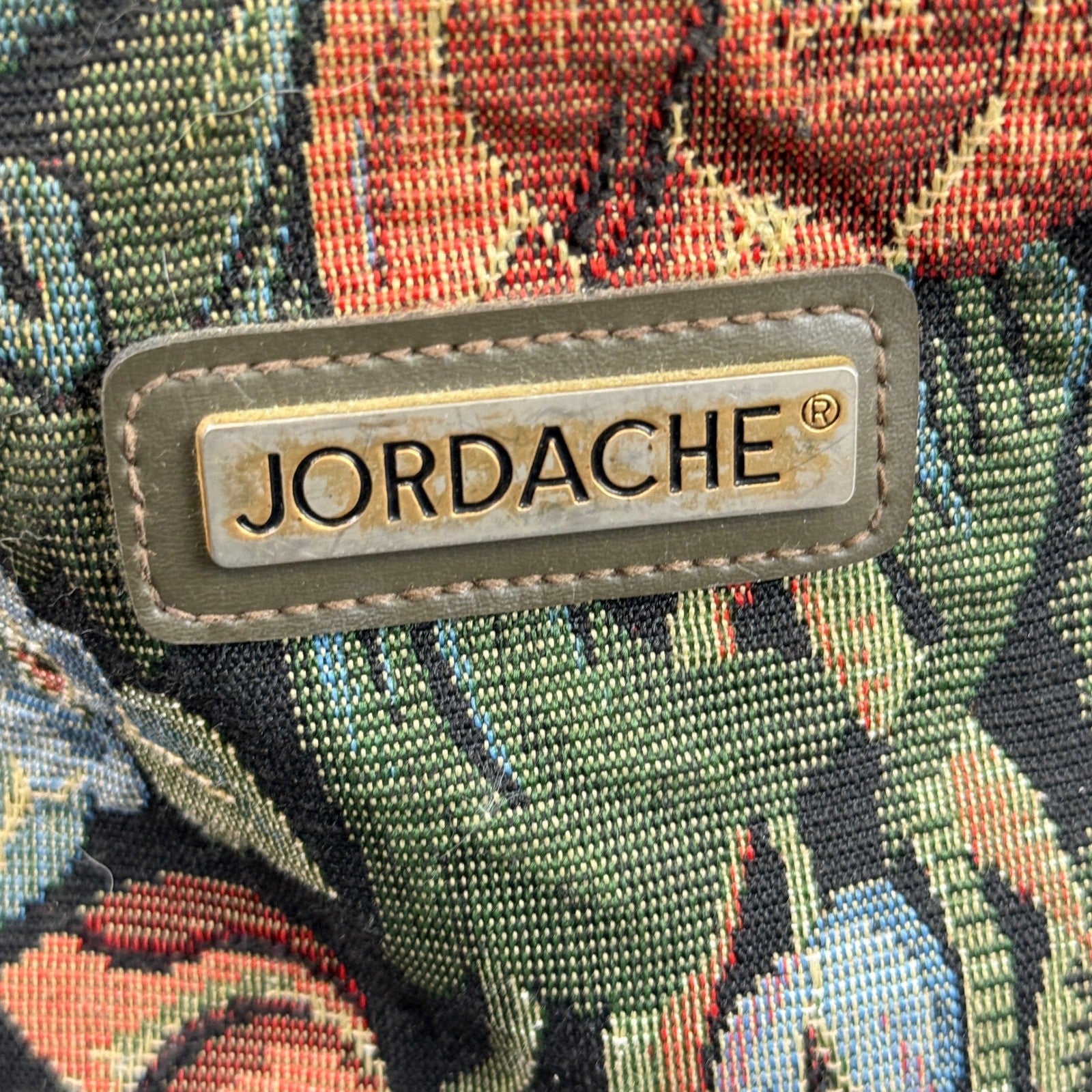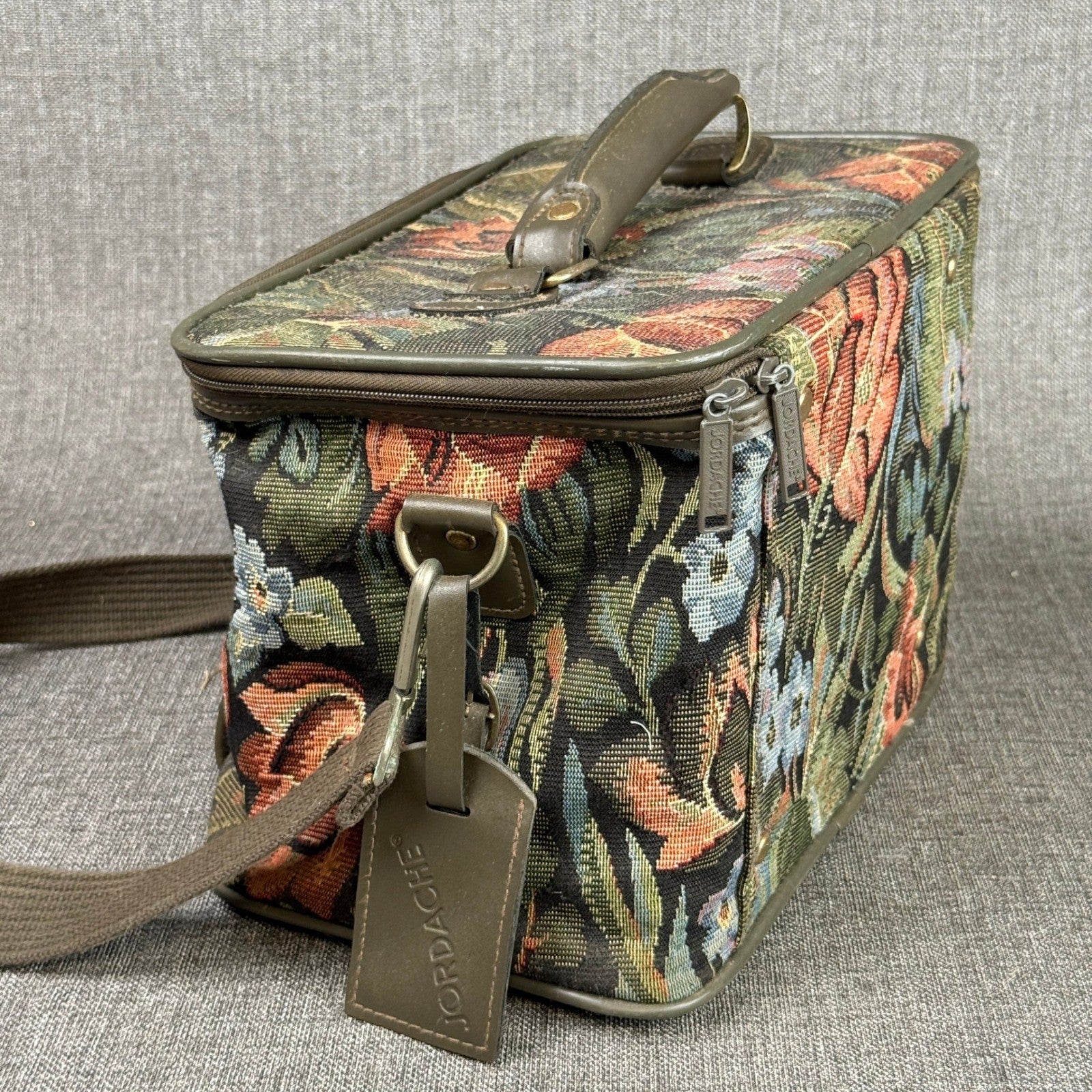 Vintage Jordache floral tapestry handbag, a distinctive travel companion showcasing a rich, multi-toned floral design woven into a durable tapestry. This bag features a structured rectangular shape with a top handle and a detachable, adjustable strap for versatile carrying options. Gold-tone hardware accents the bag, including the zipper pulls and strap attachments, complementing the earthy tones of the floral pattern. A branded strap is included, adding to the bag's vintage charm.