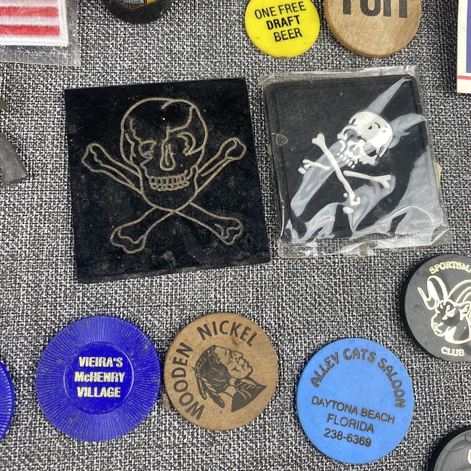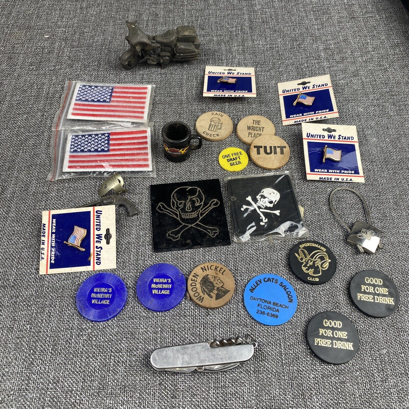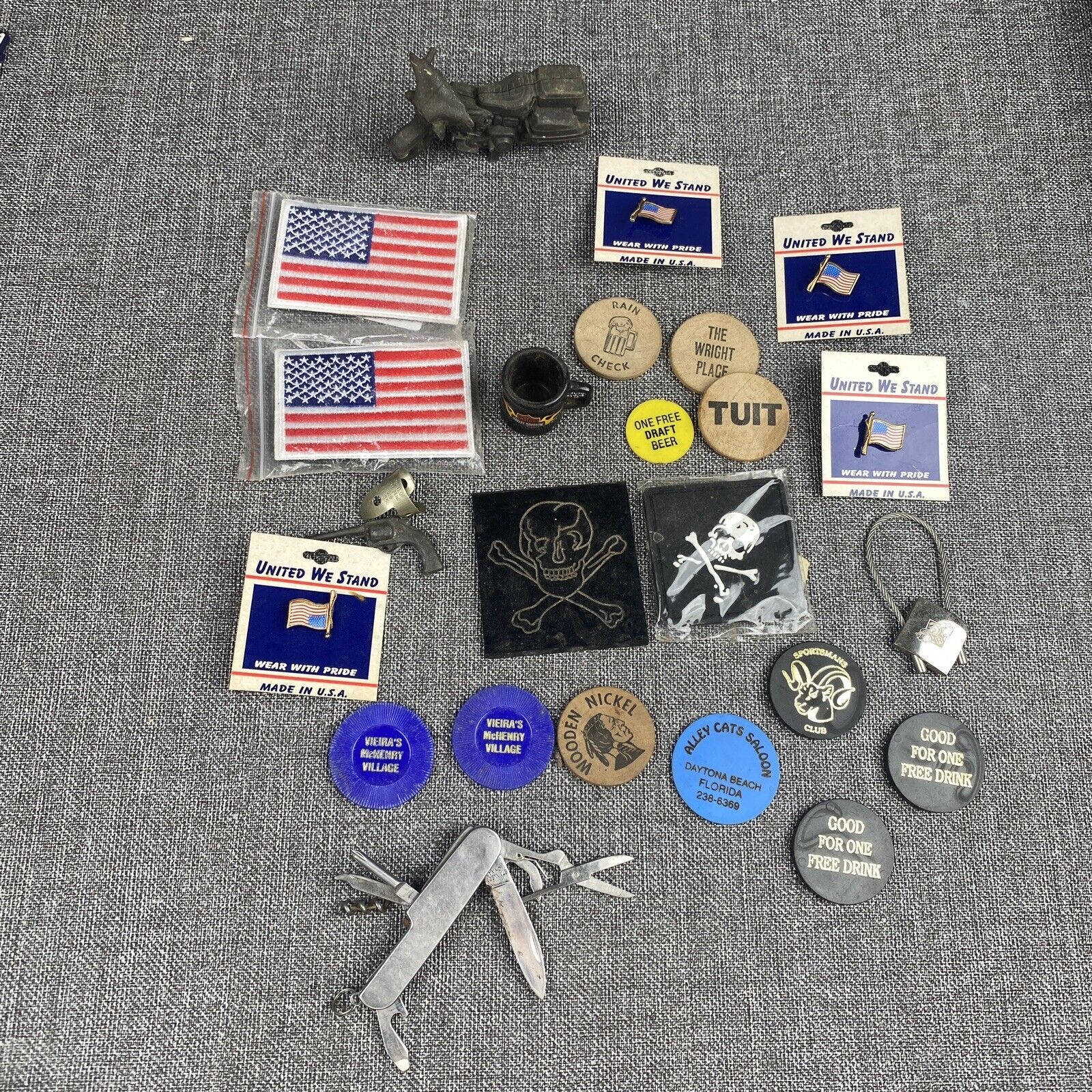 Junk Drawer Harley, Beer Tokens, Patches, US Flag Pins, Skulls, etc