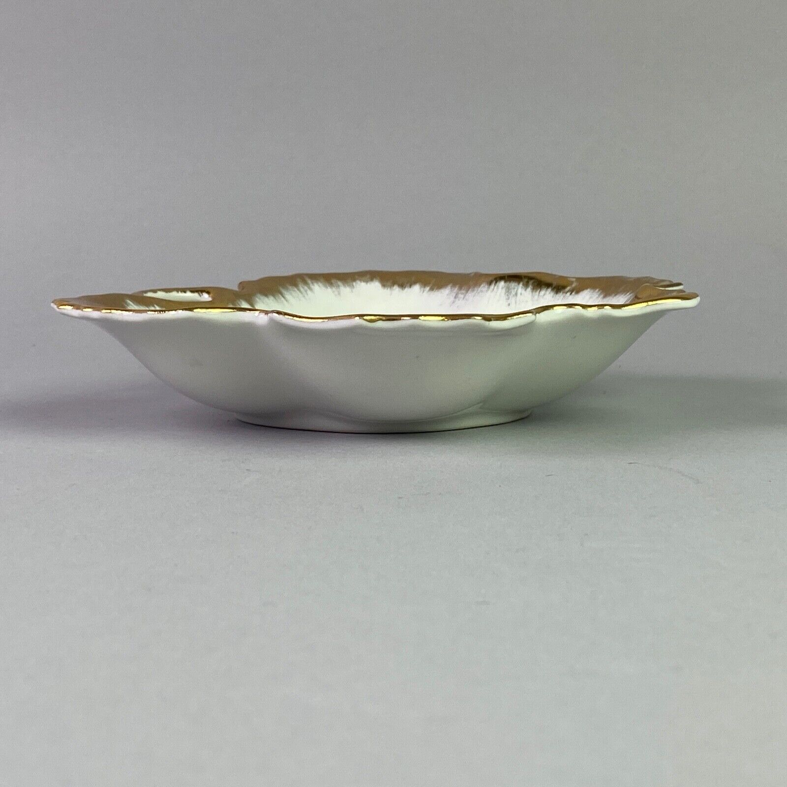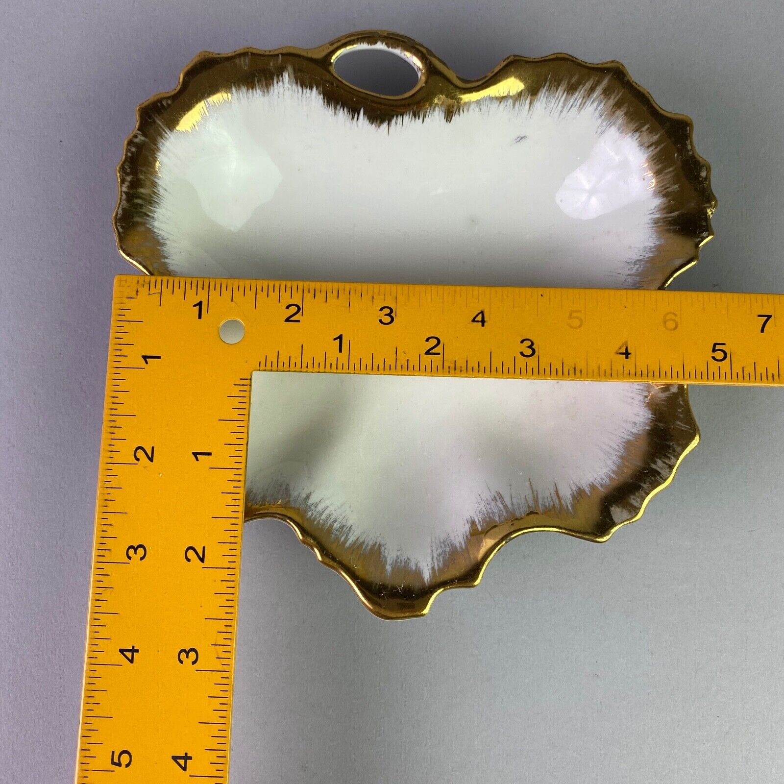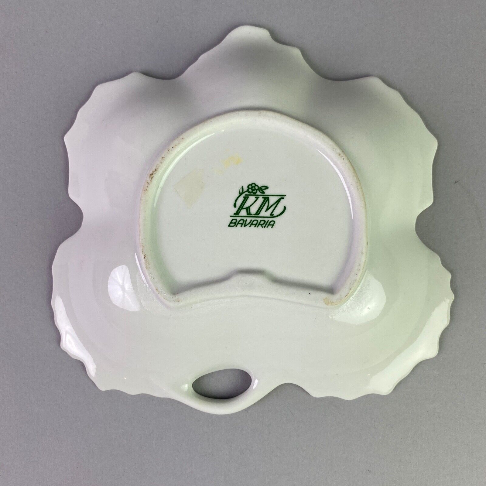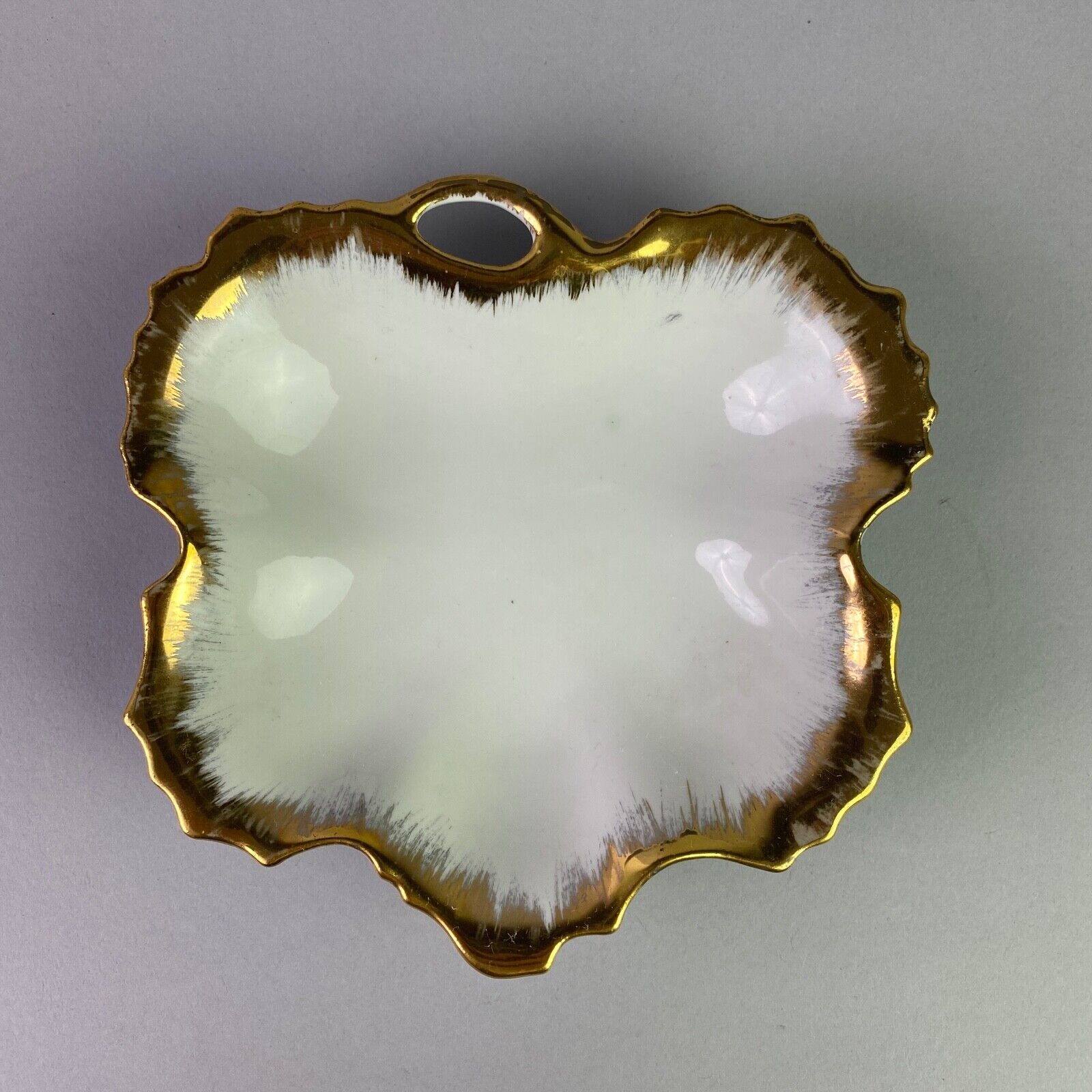 View images for specific details on the condition of the KM Bavaria Leaf Tray with Gold Trim, measuring 6.5" in diameter and used as a trinket holder.
