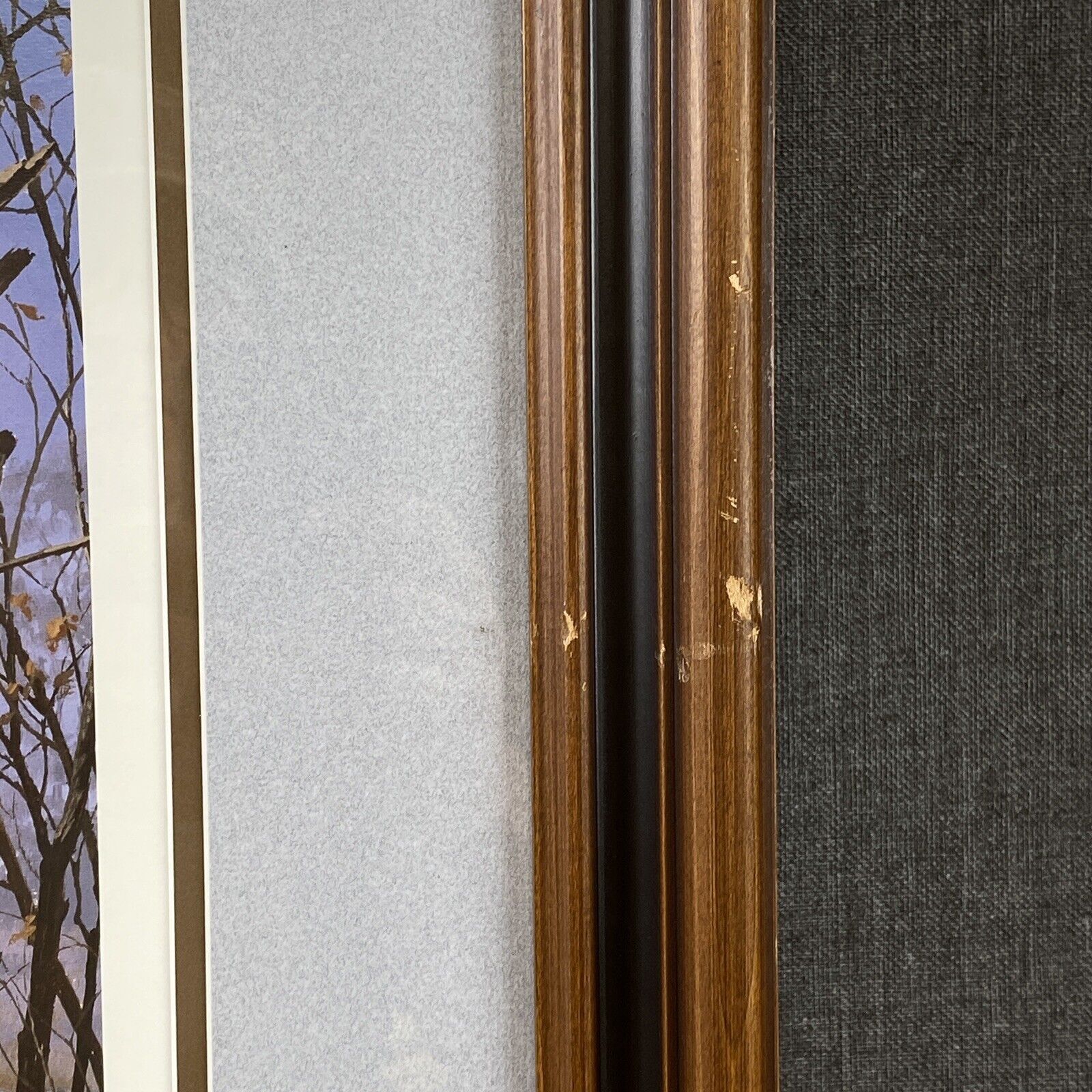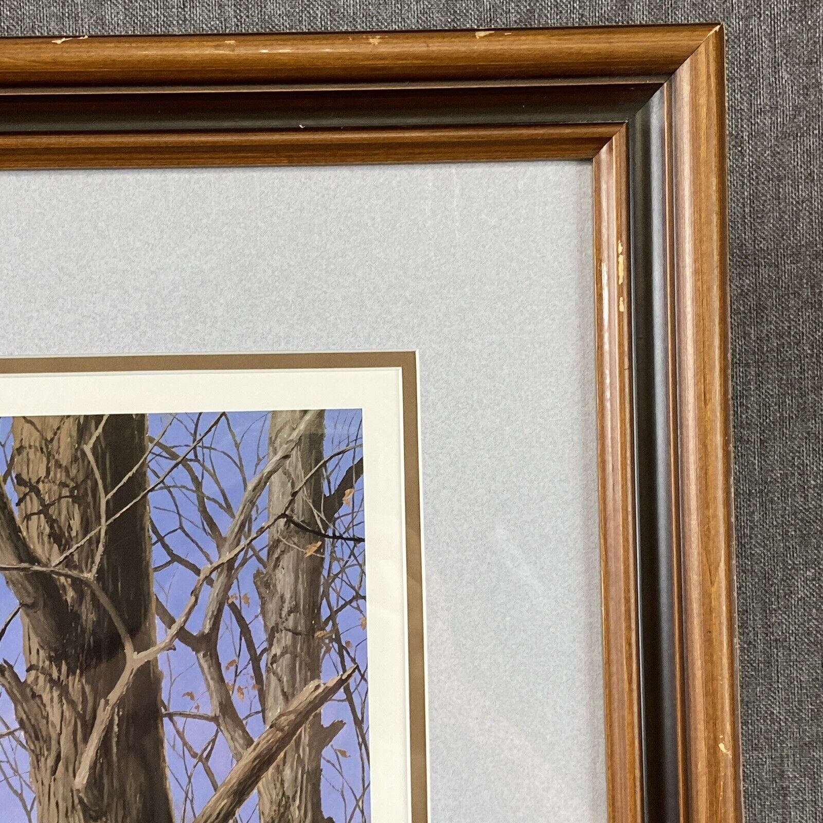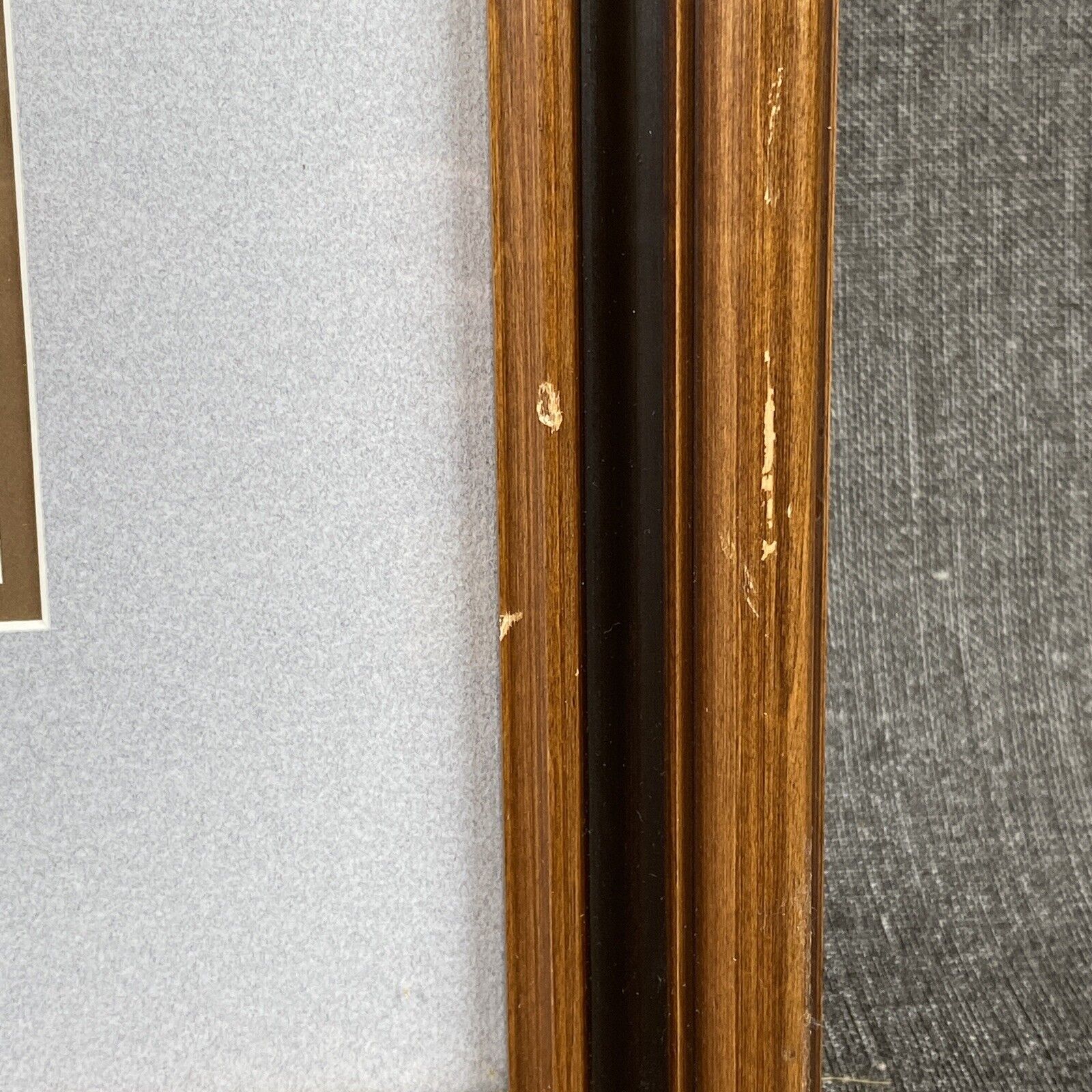 - matted and framed behind glass, wooden ornate frame , brown color