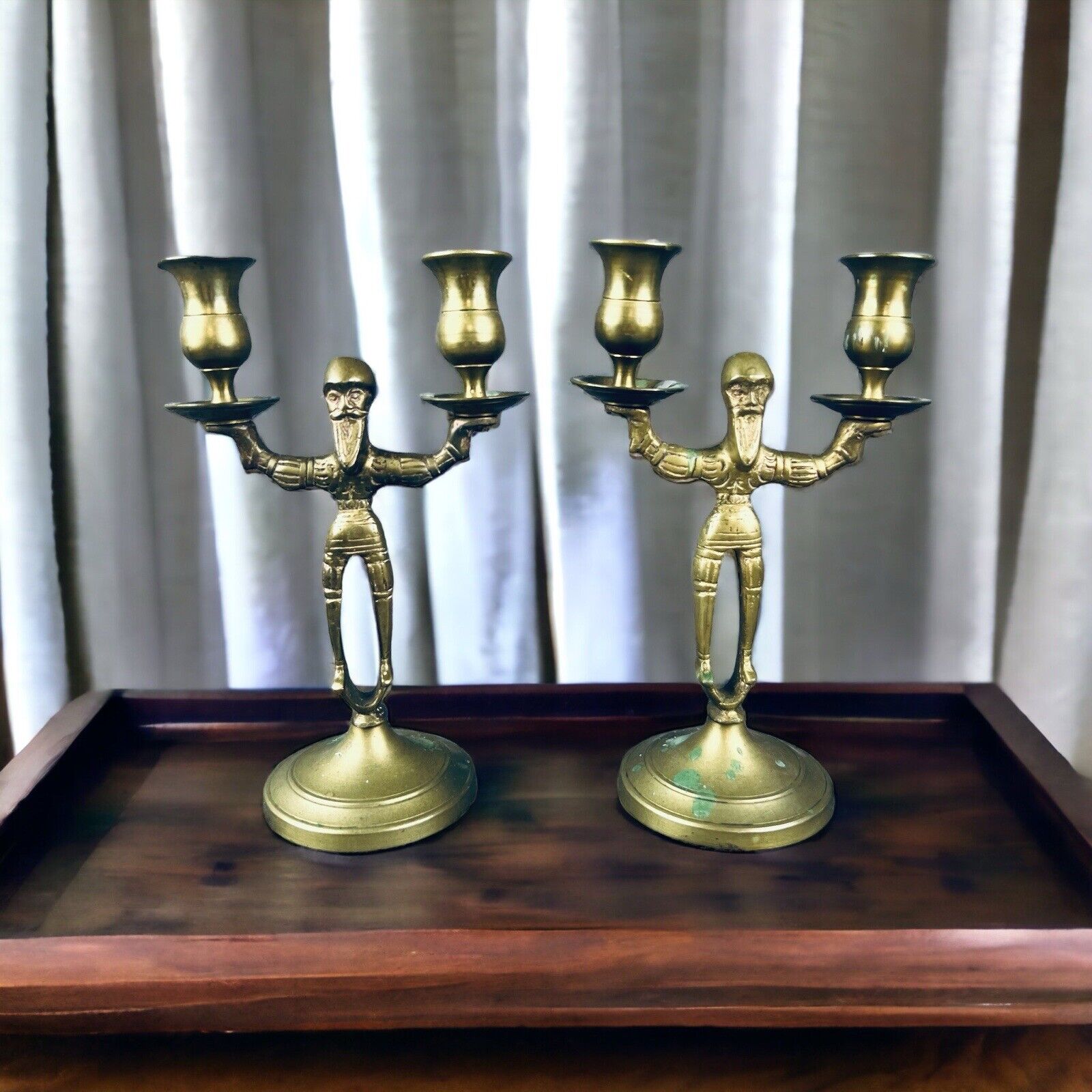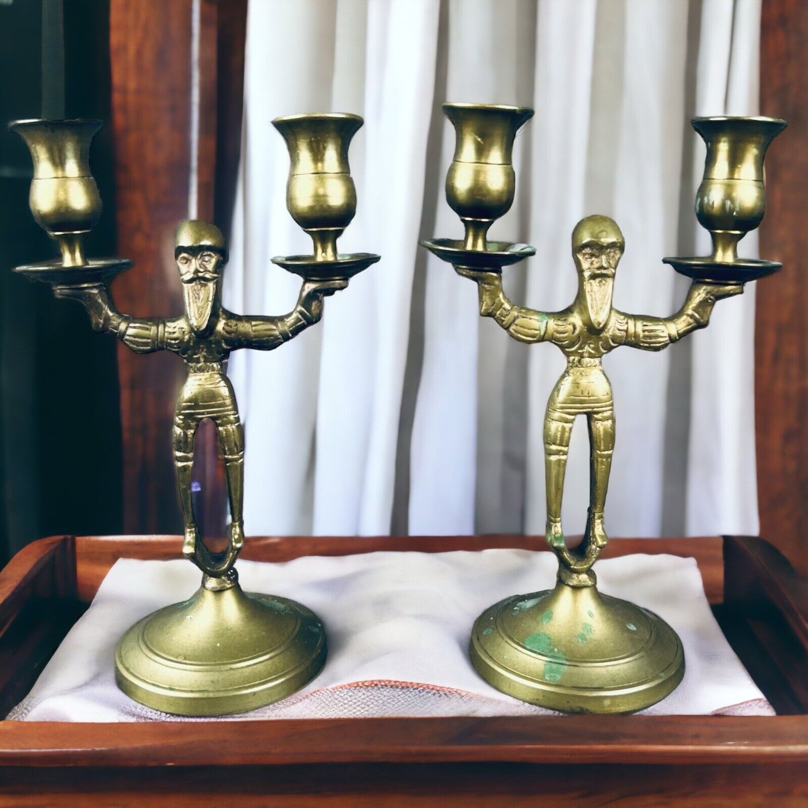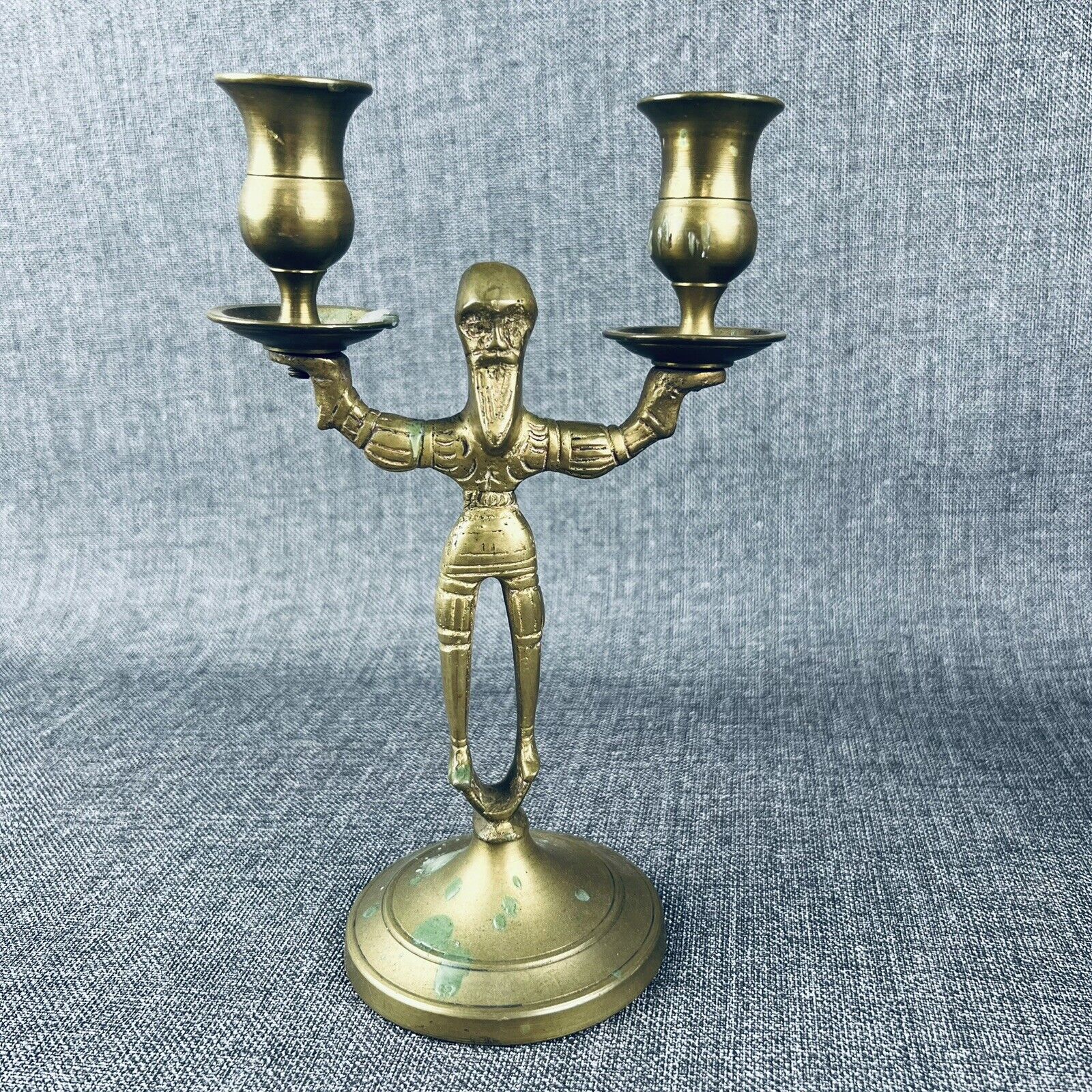 This pair of candle holders is a unique addition to any home decor. Made of solid brass, they feature an intricate design of an old man with a beard. The golden color adds an elegant touch to the candle holders, making them perfect for any occasion. The set includes two candle holders, each measuring 9.25 inches in height.