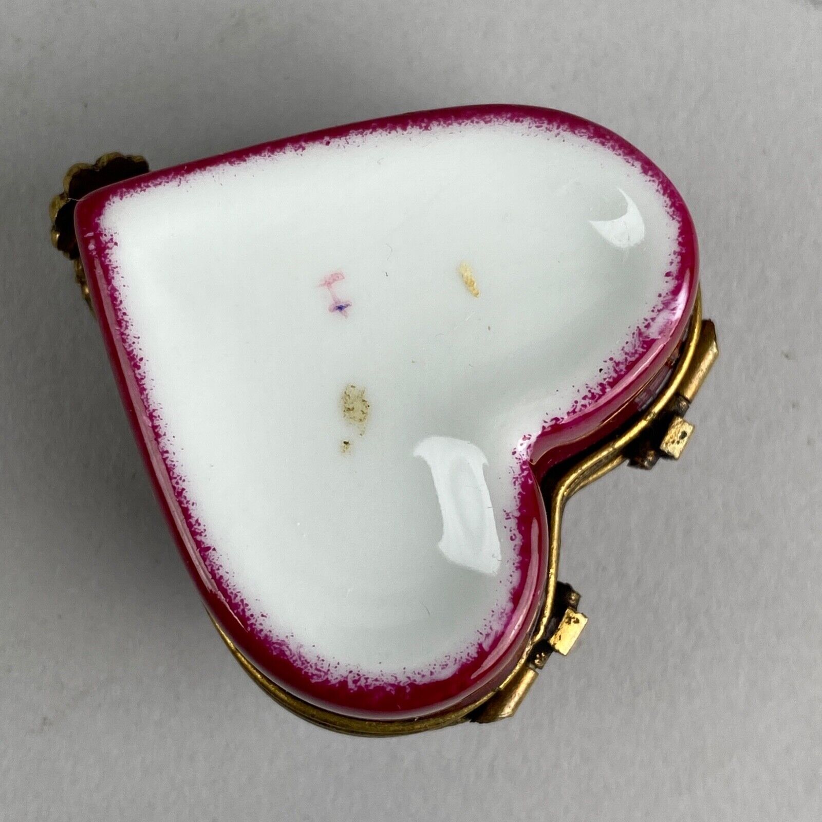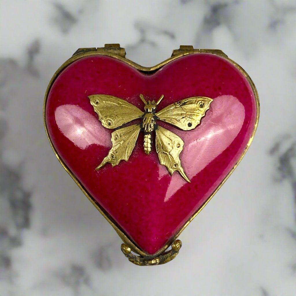 This is a vintage, porcelain trinket box. It is deep red with a gold tone butterfly and accents. The item is approximately 2 inches long and in good condition with only minor noticeable imperfects due to its age. Please see the photos for more details.