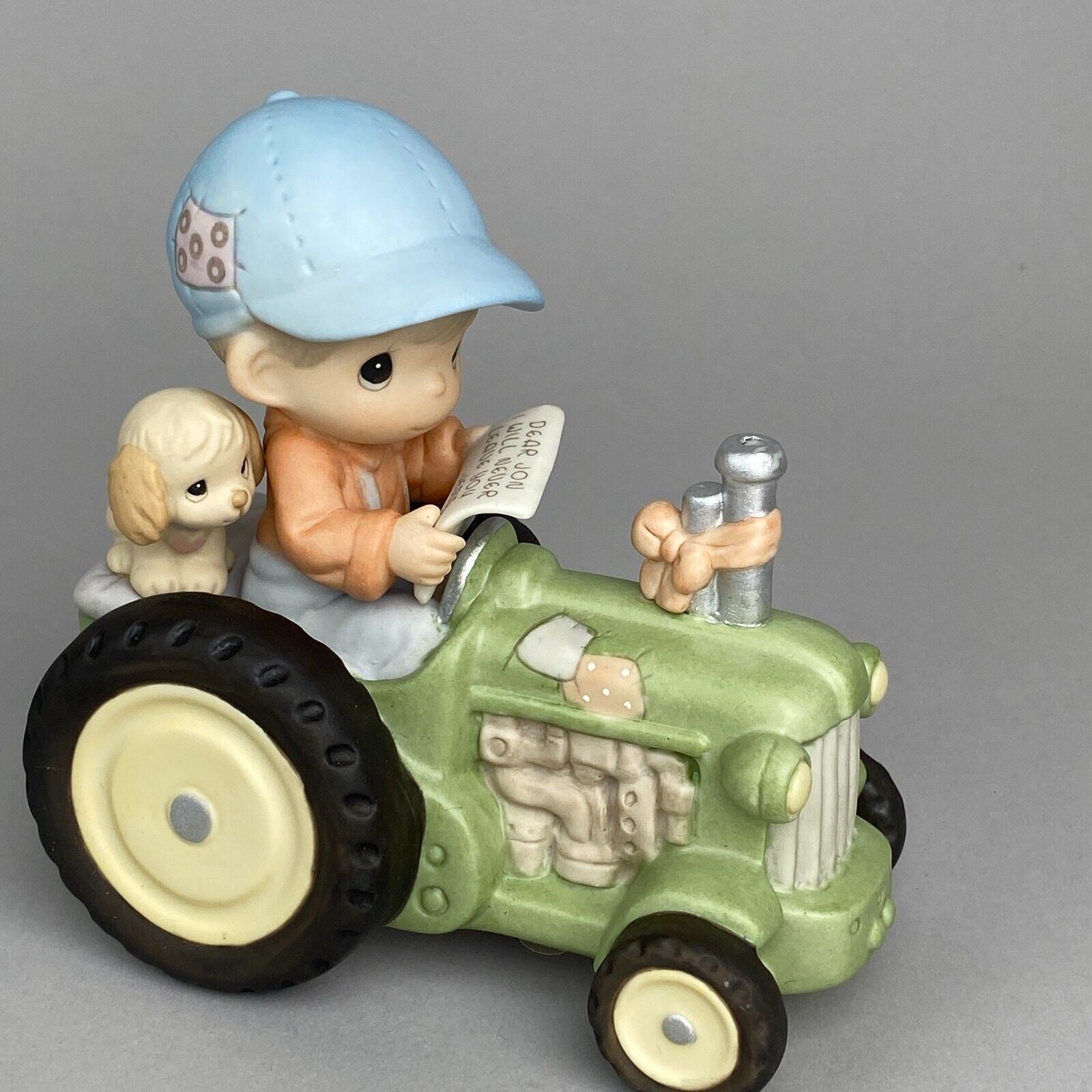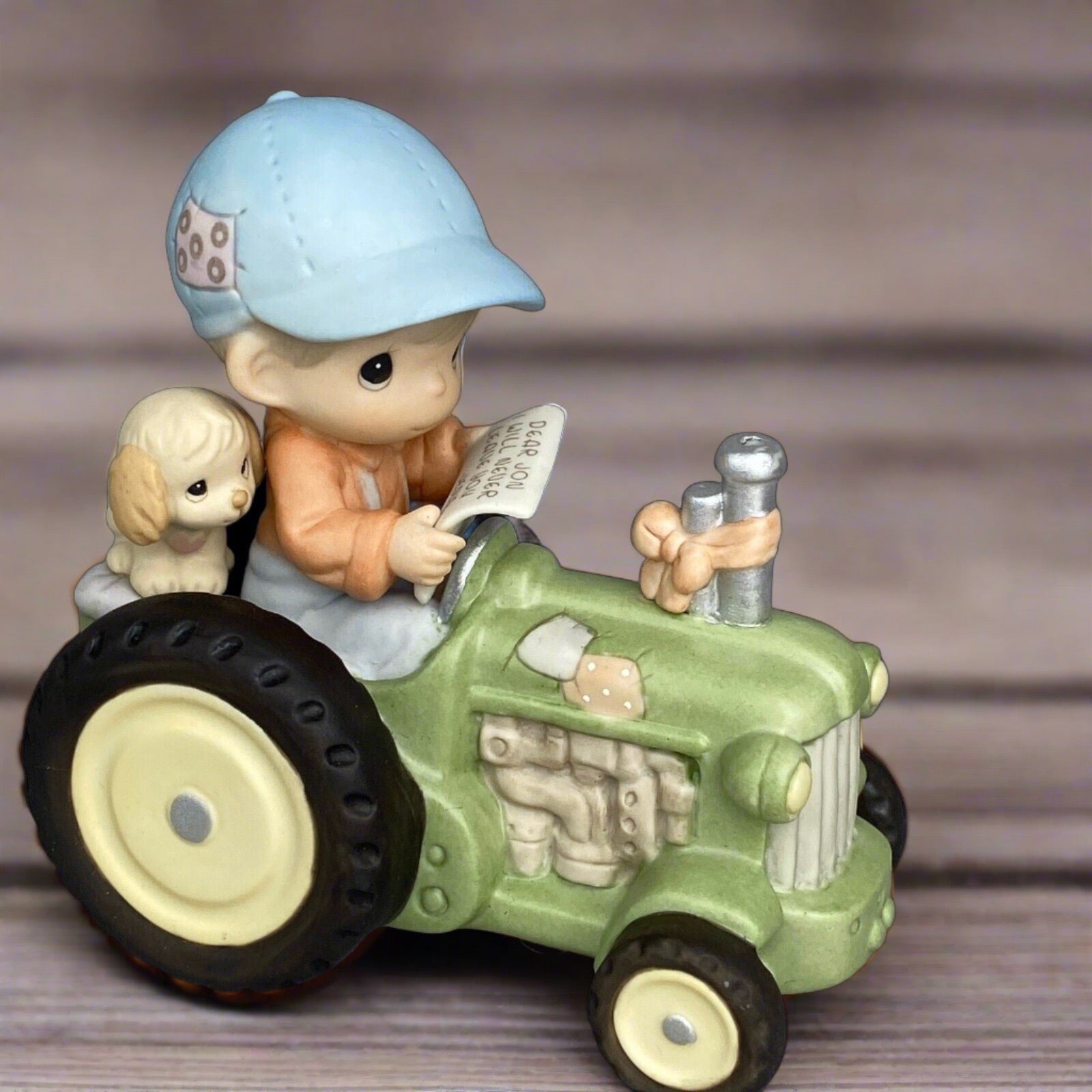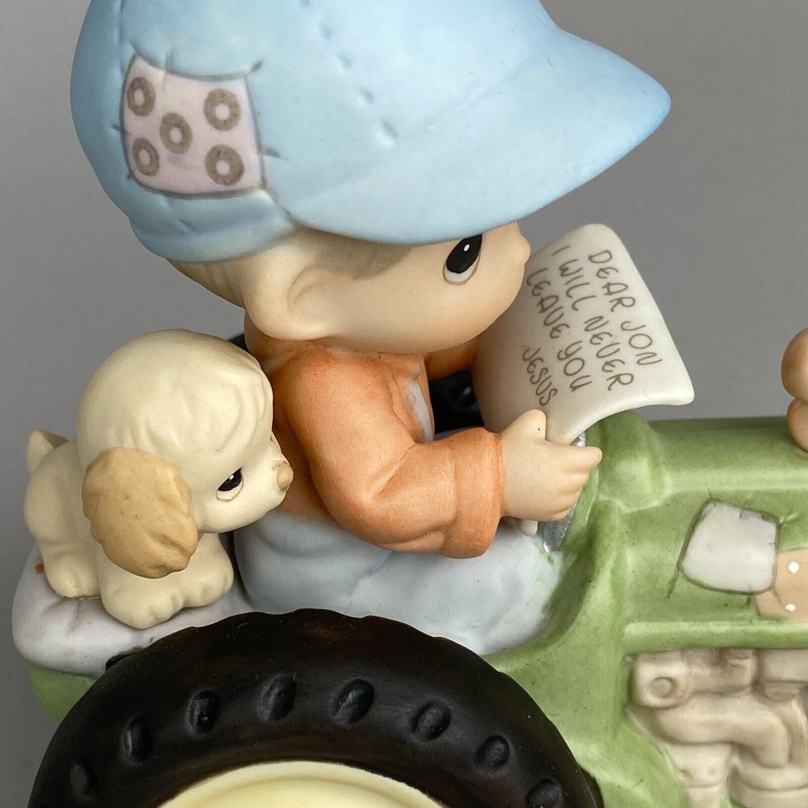This is a collectible vintage Enesco Precious Moments figurine called "Dear Jon, I Will Never Leave You. Jesus". The figurine depicts a young boy on a tractor with his dog reading a note from Jesus. It was made in the year 1999 Star and is 5" tall, with the item number 588091.