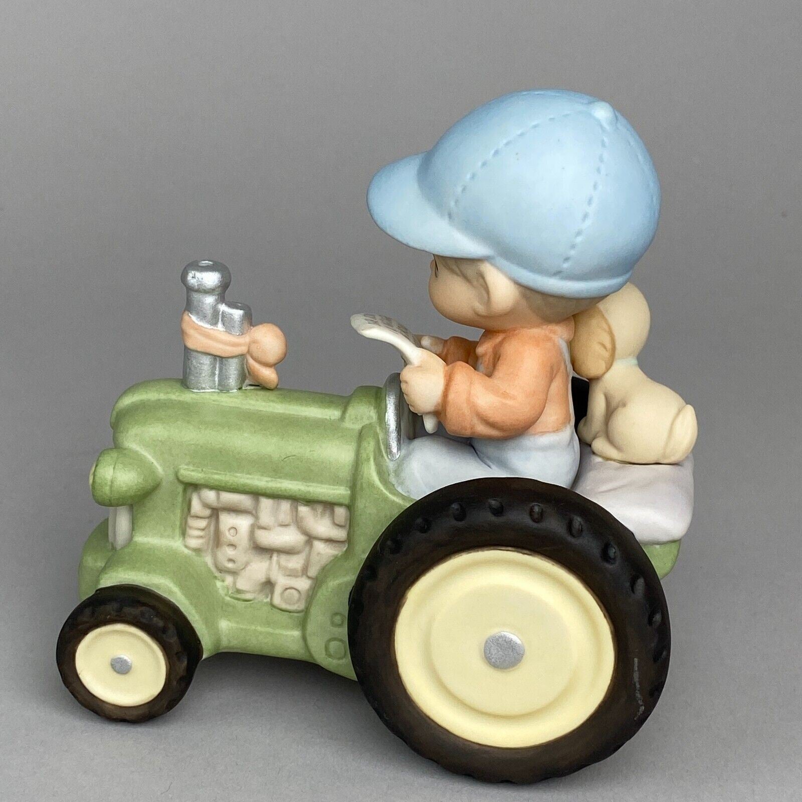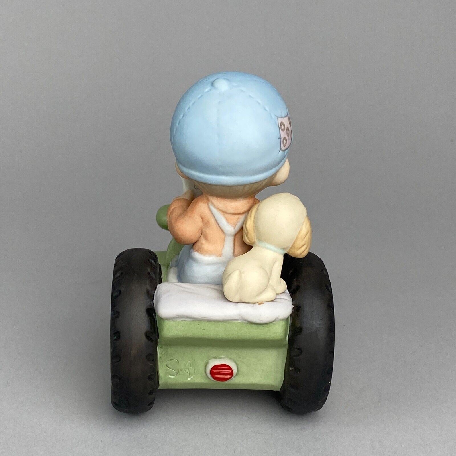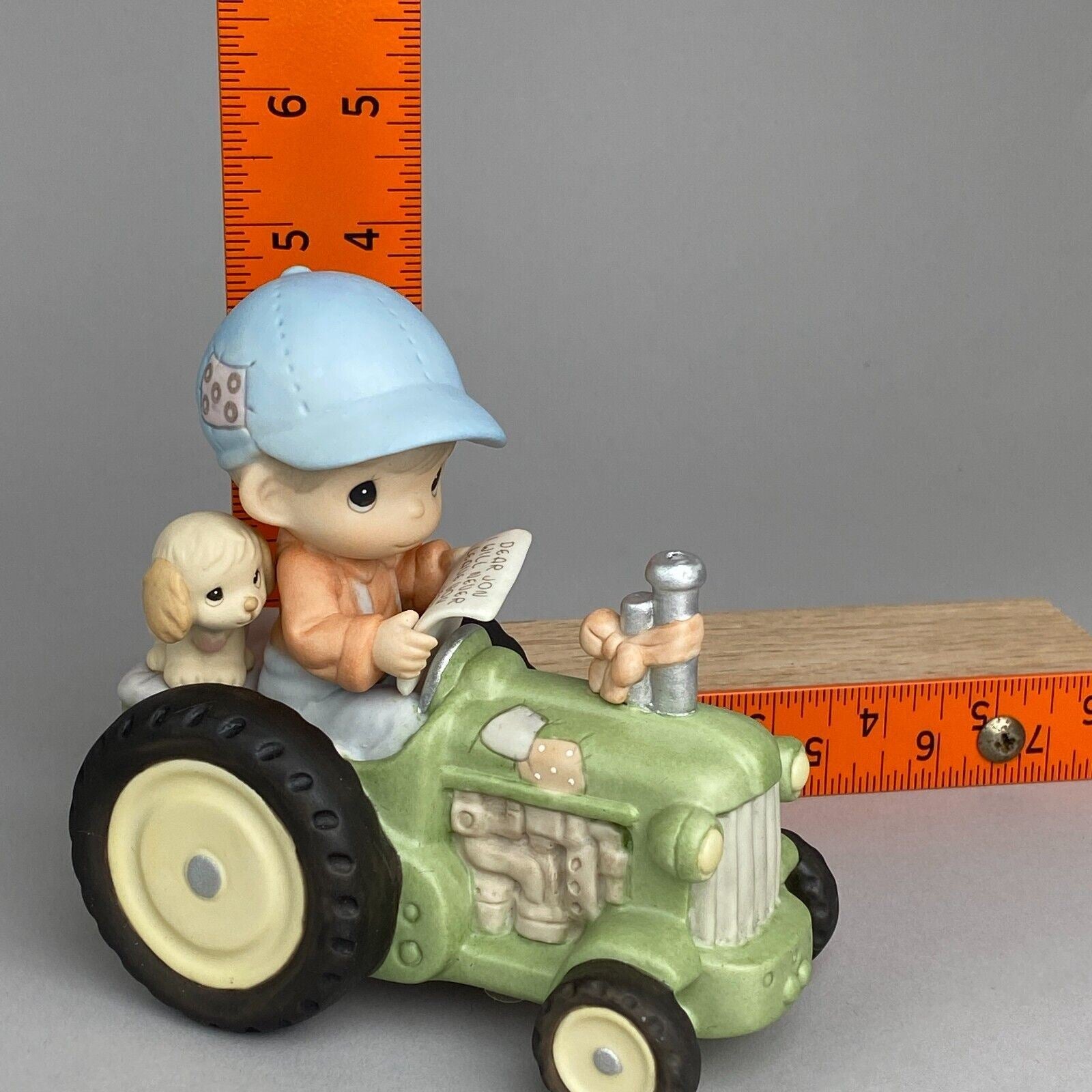 This is a collectible vintage Enesco Precious Moments figurine called "Dear Jon, I Will Never Leave You. Jesus". The figurine depicts a young boy on a tractor with his dog reading a note from Jesus. It was made in the year 1999 Star and is 5" tall, with the item number 588091.