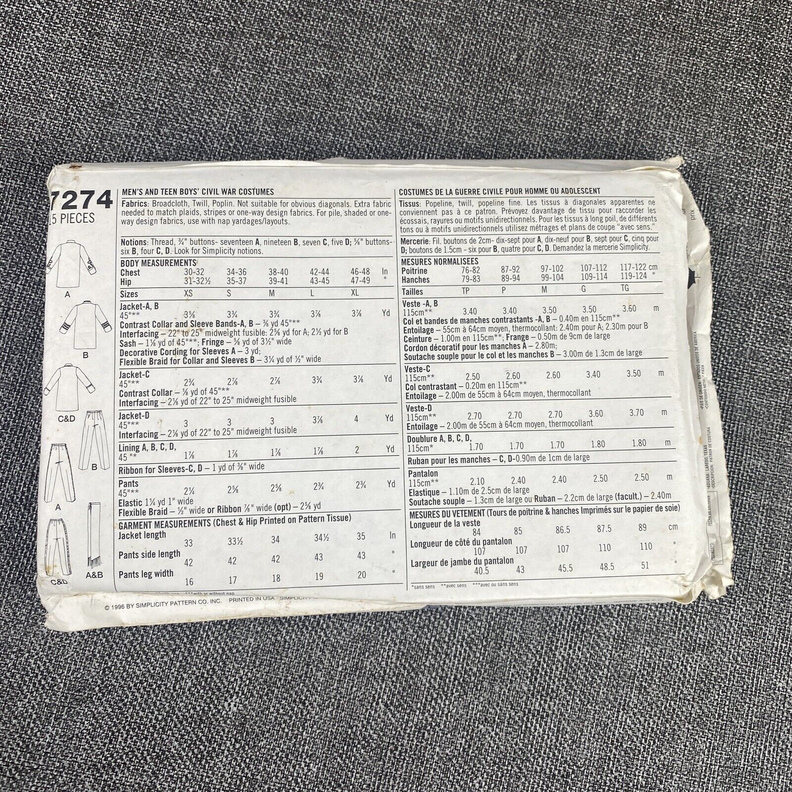 Simplicity 7274 Civil War Soldier Military Costume XS S M L XL Sewing Pattern