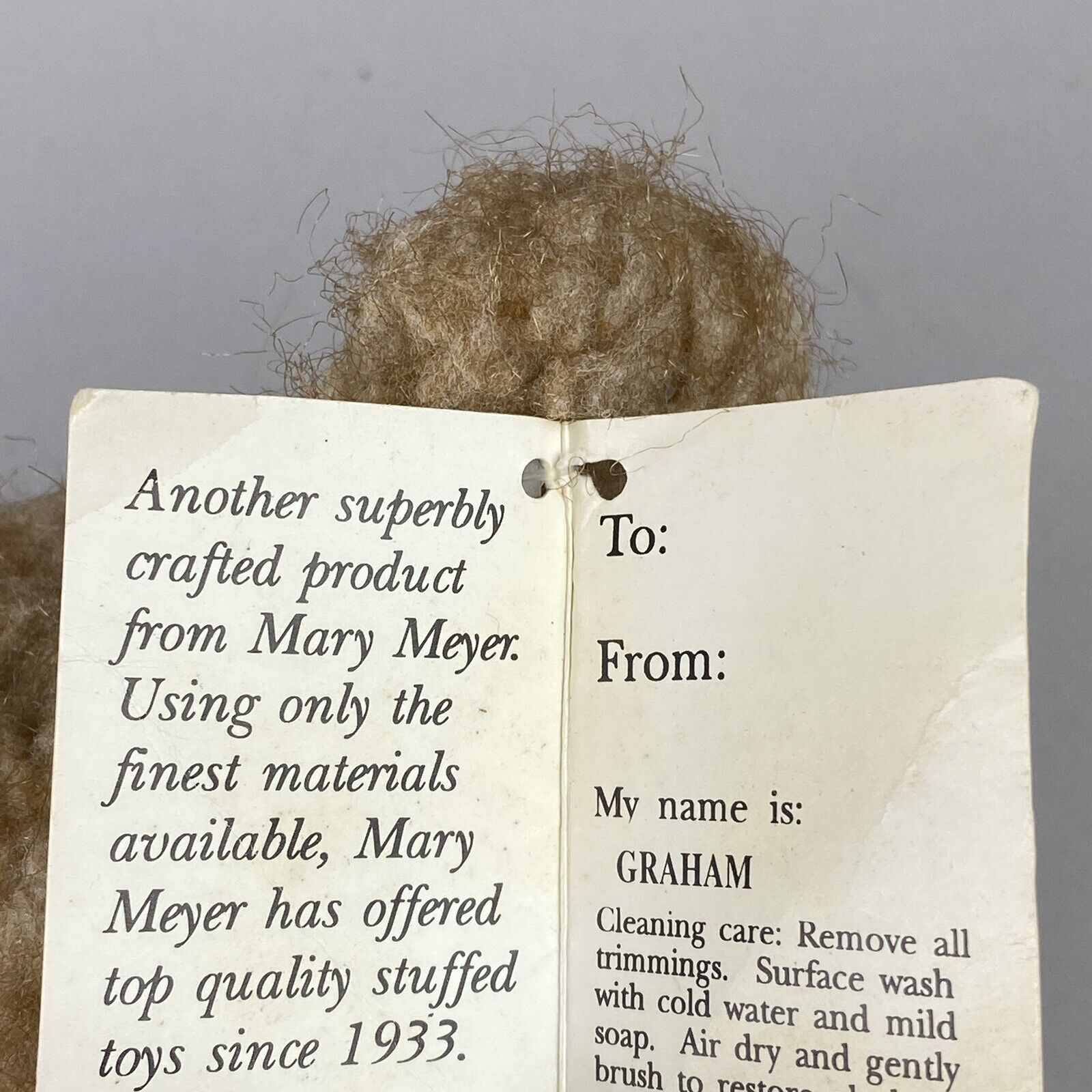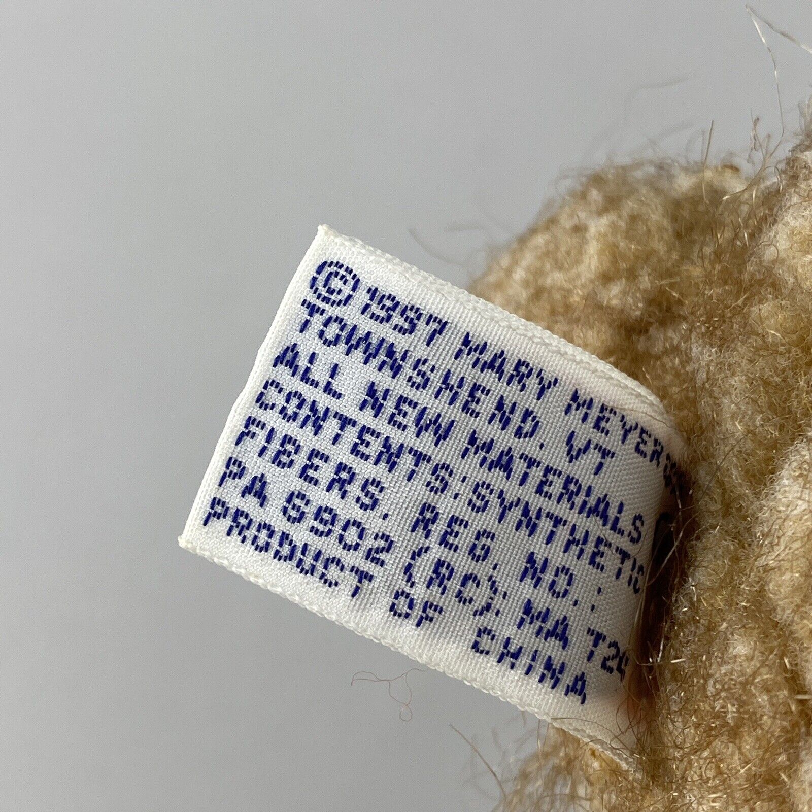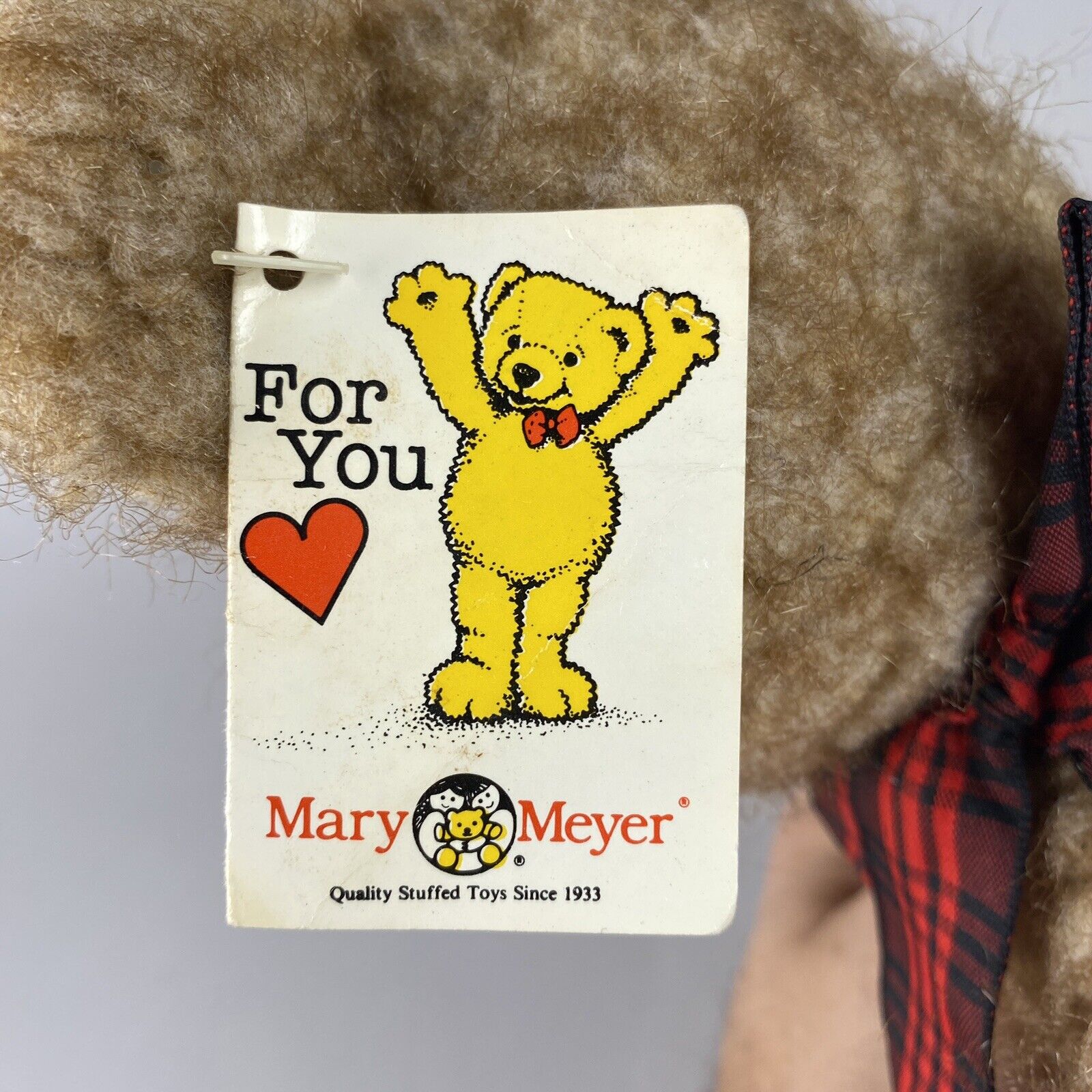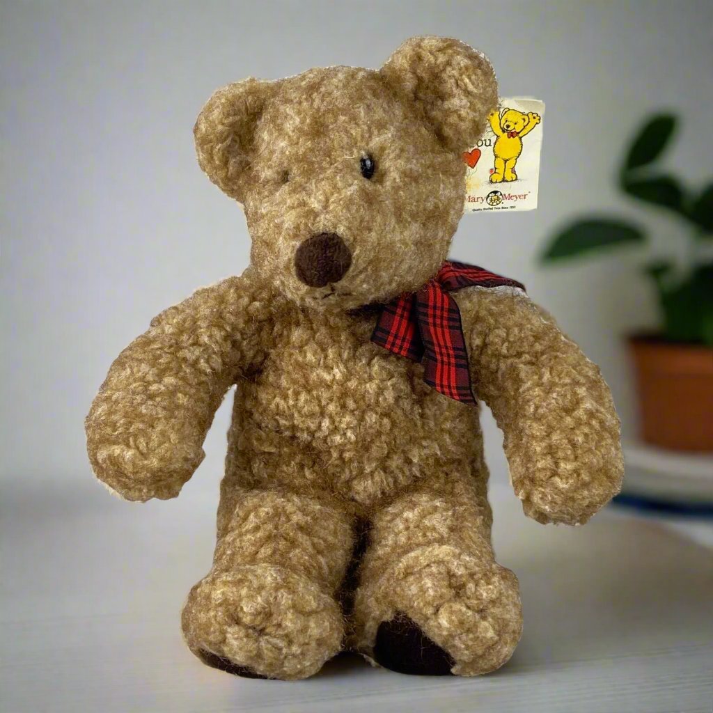 This is a vintage tan teddy bear plush stuffed animal wearing a plaid bow made by Mary Meyers in 1997. It is in good condition with no noticeable imperfections and the original tags are still attached. Please see the photos for more details.