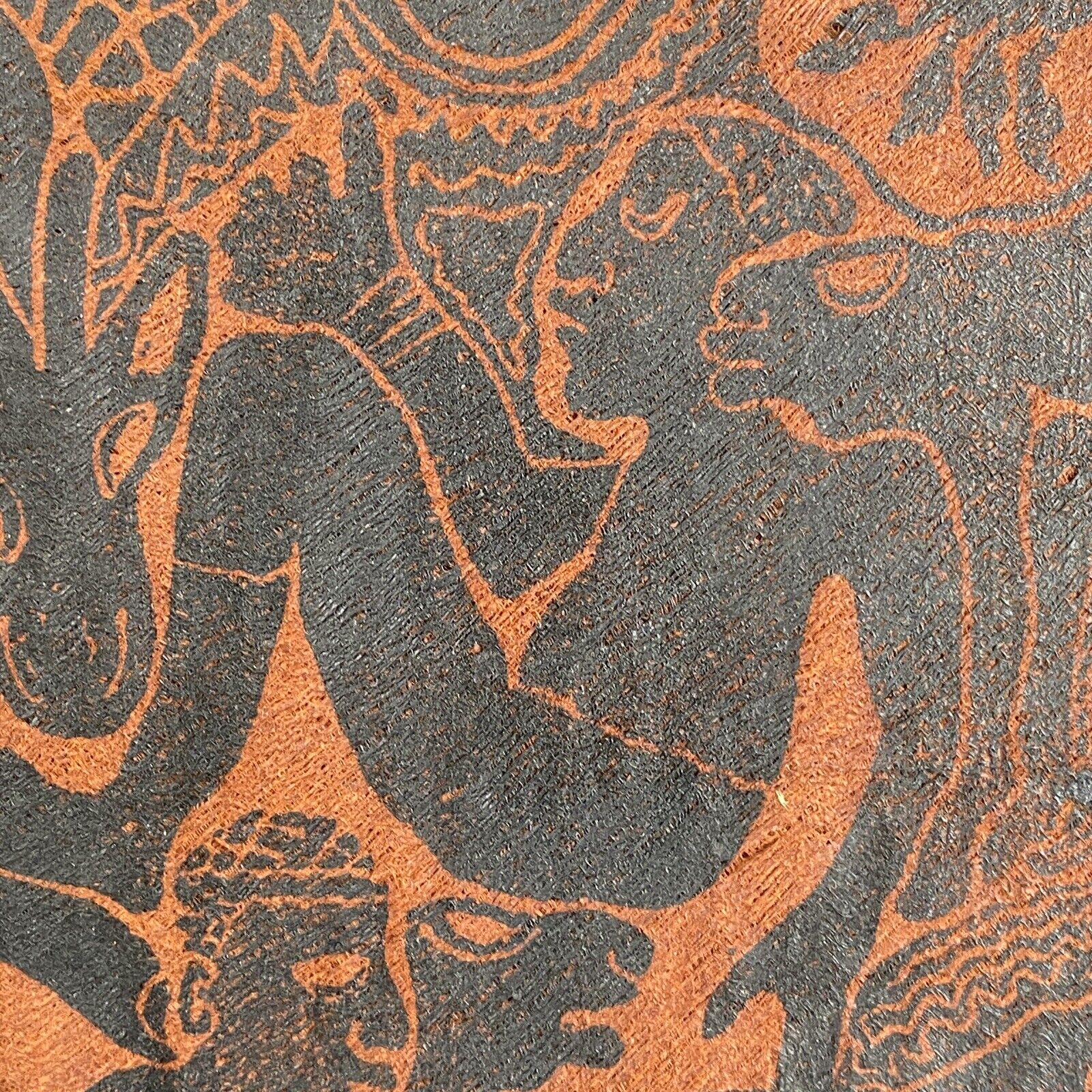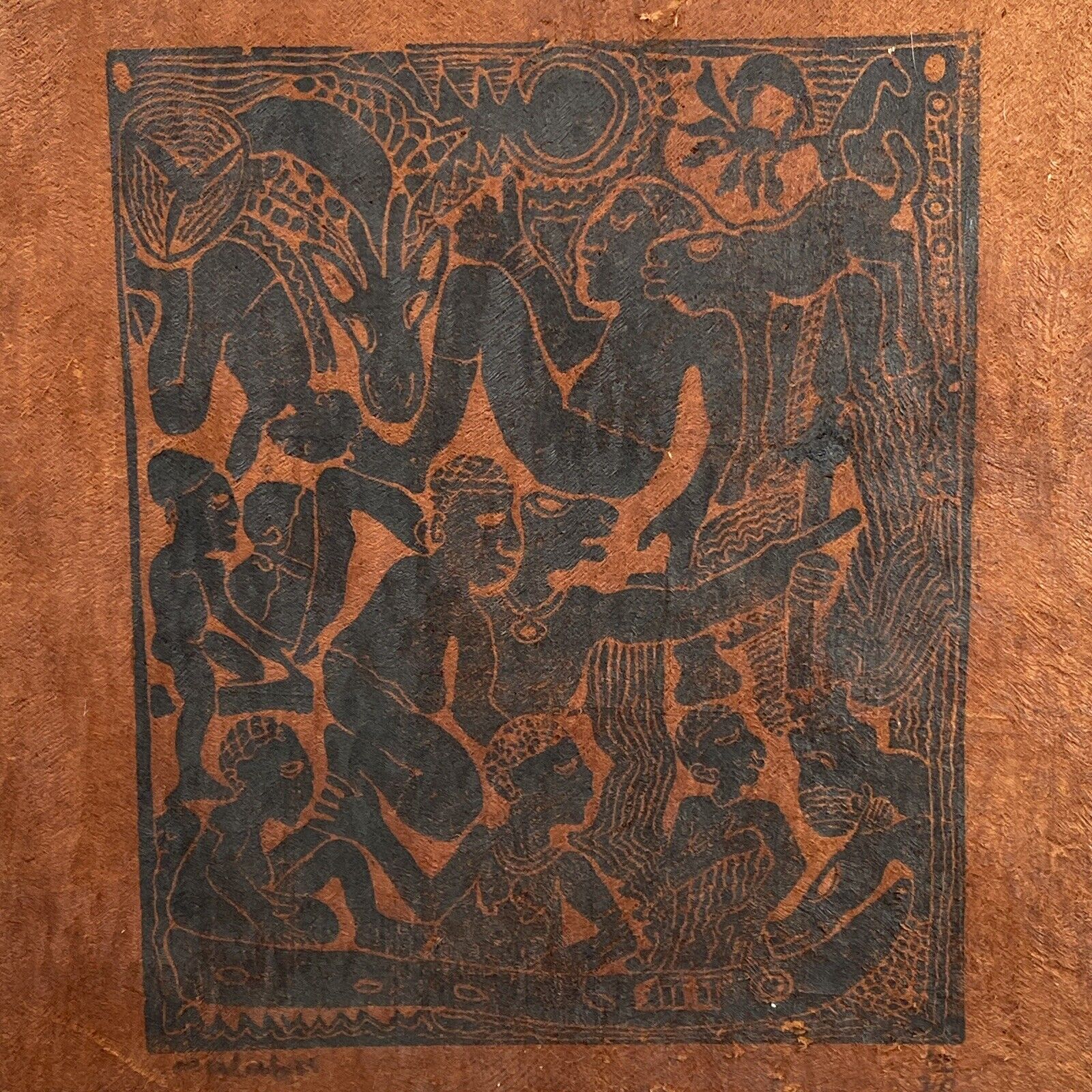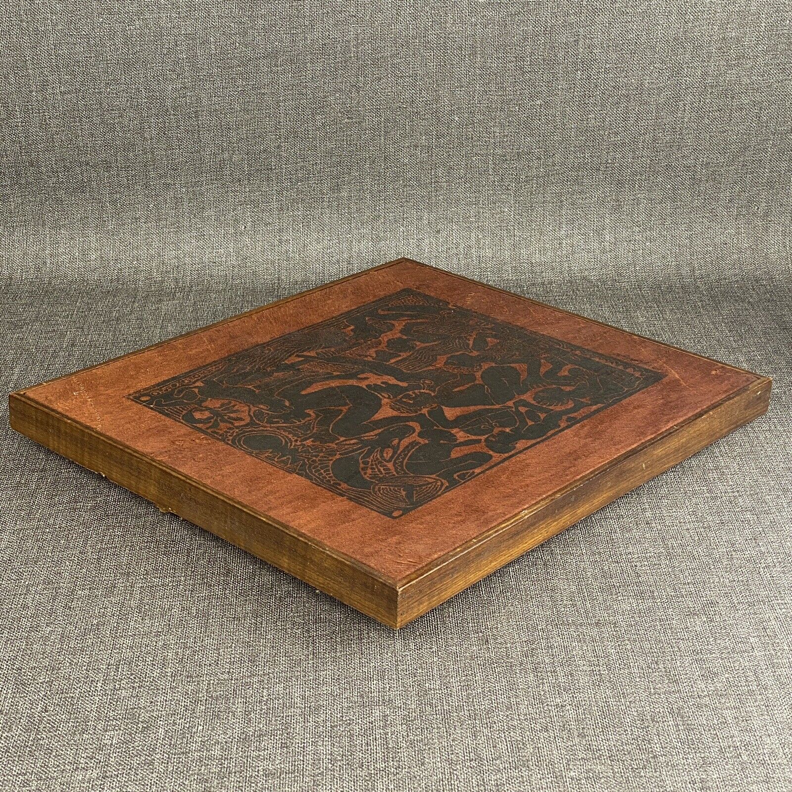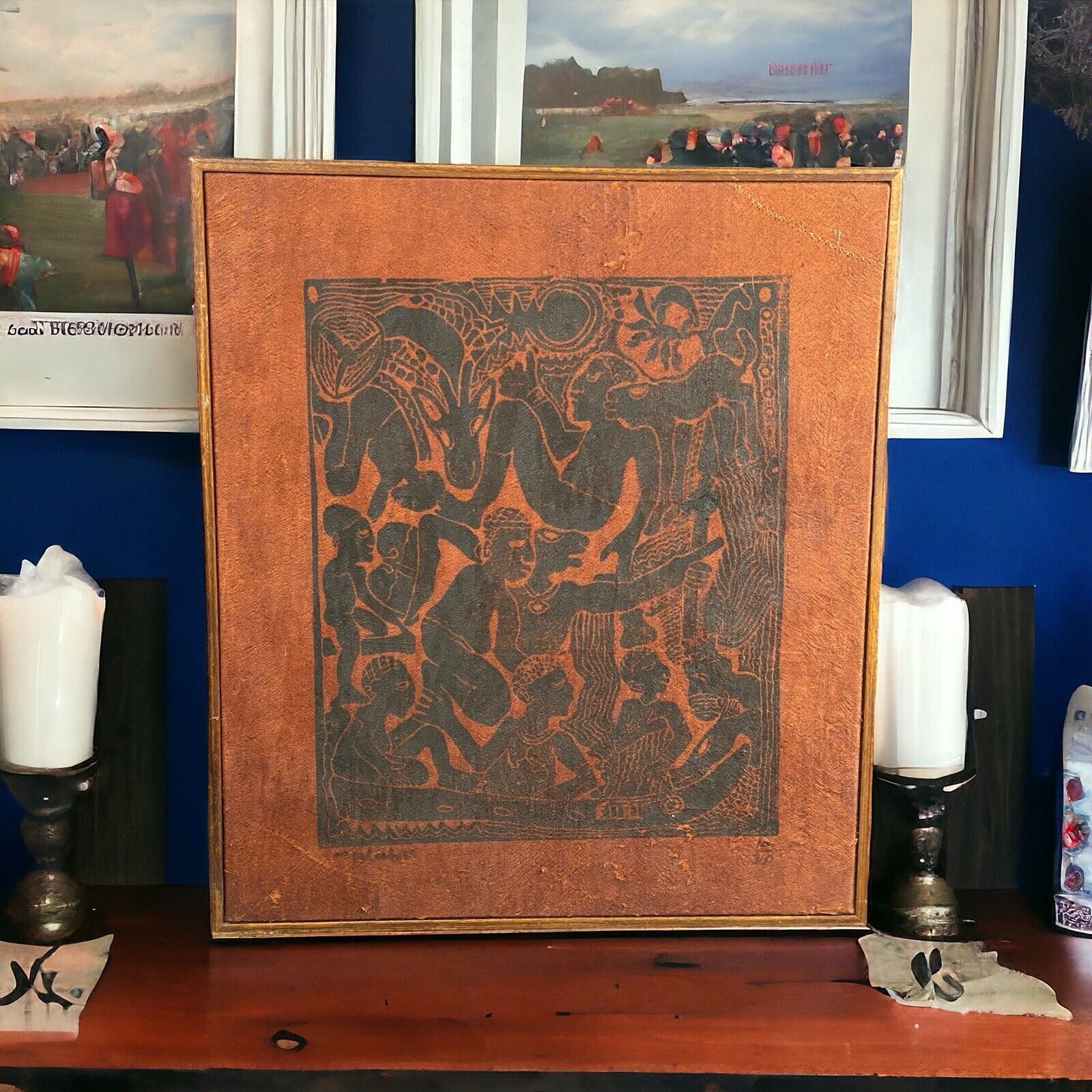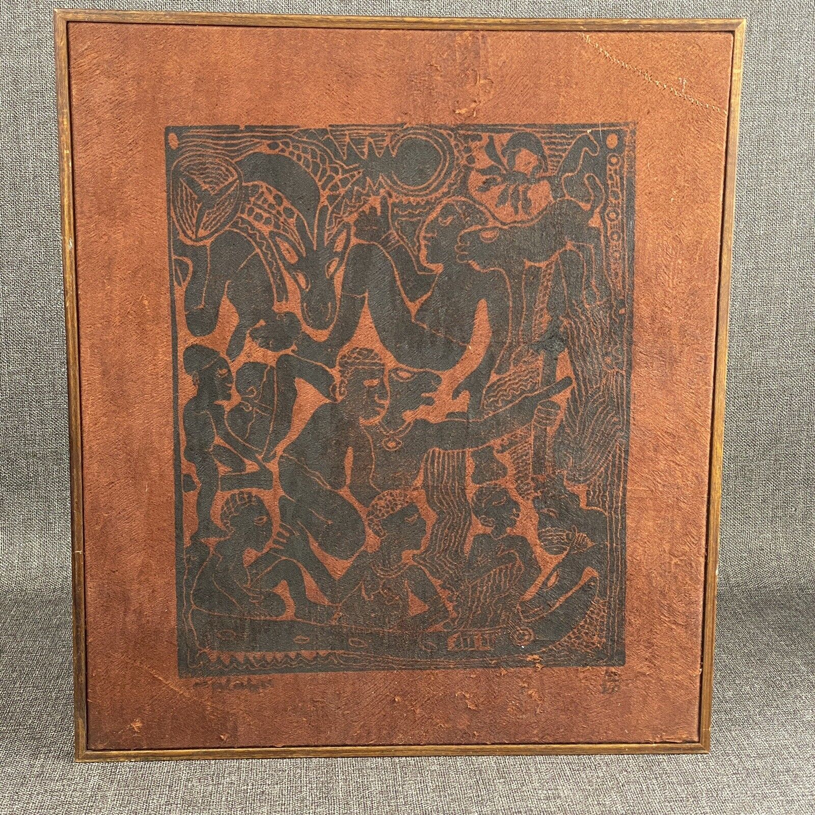 I am unable to identify this art but it is on Leather, see photos and let me know if you have any questions
