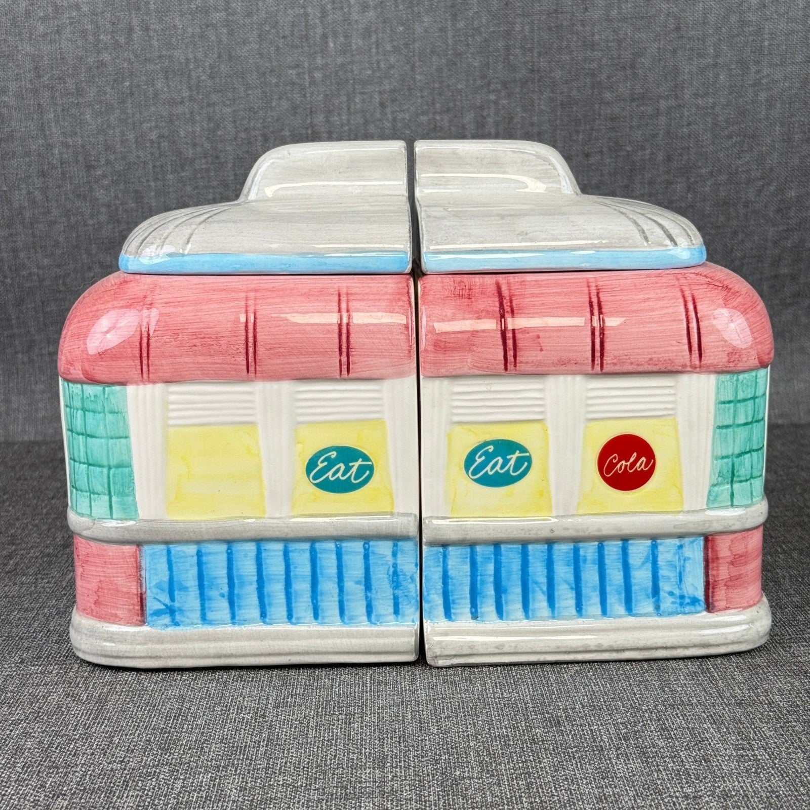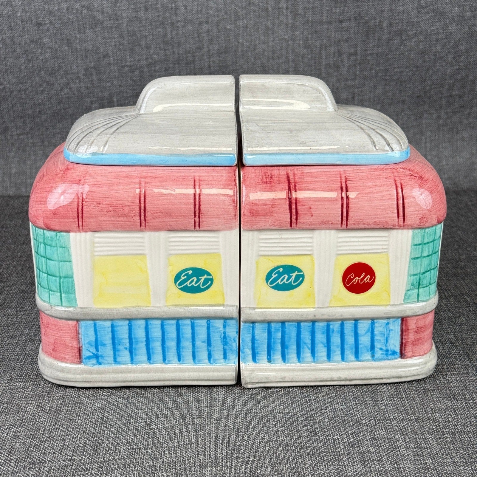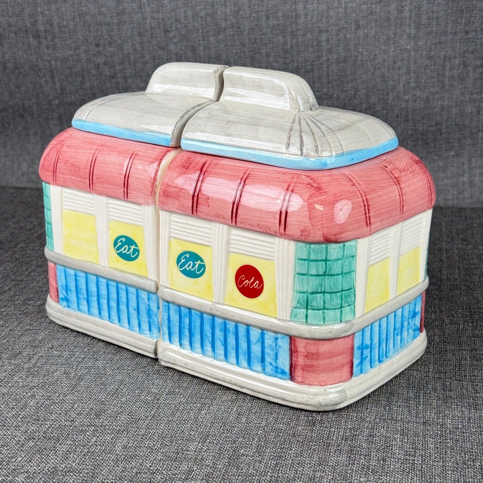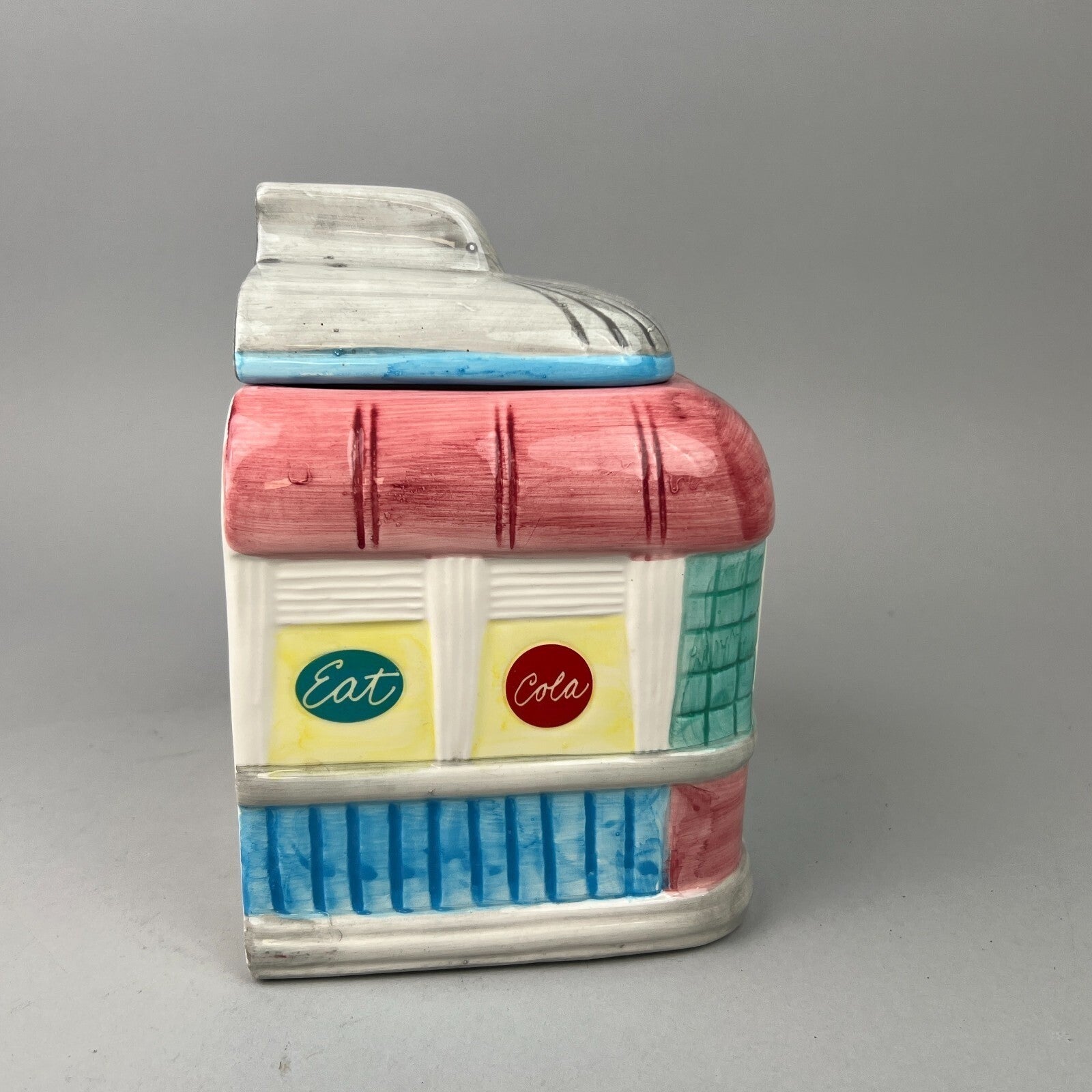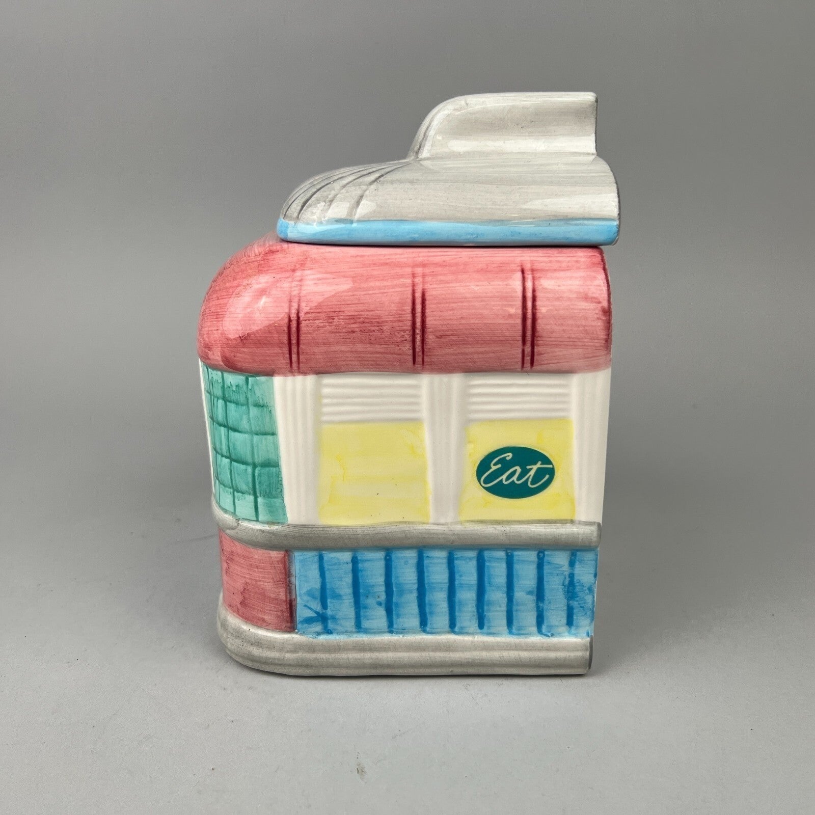 Keywords: vintage cookie jar, diner cookie jar, restaurant cookie jar, ceramic cookie jar, retro kitchen decor, 50s diner, soda shop, eat sign, cola sign, collectible cookie jar, novelty cookie jar, kitchen storage, retro diner, vintage kitchen