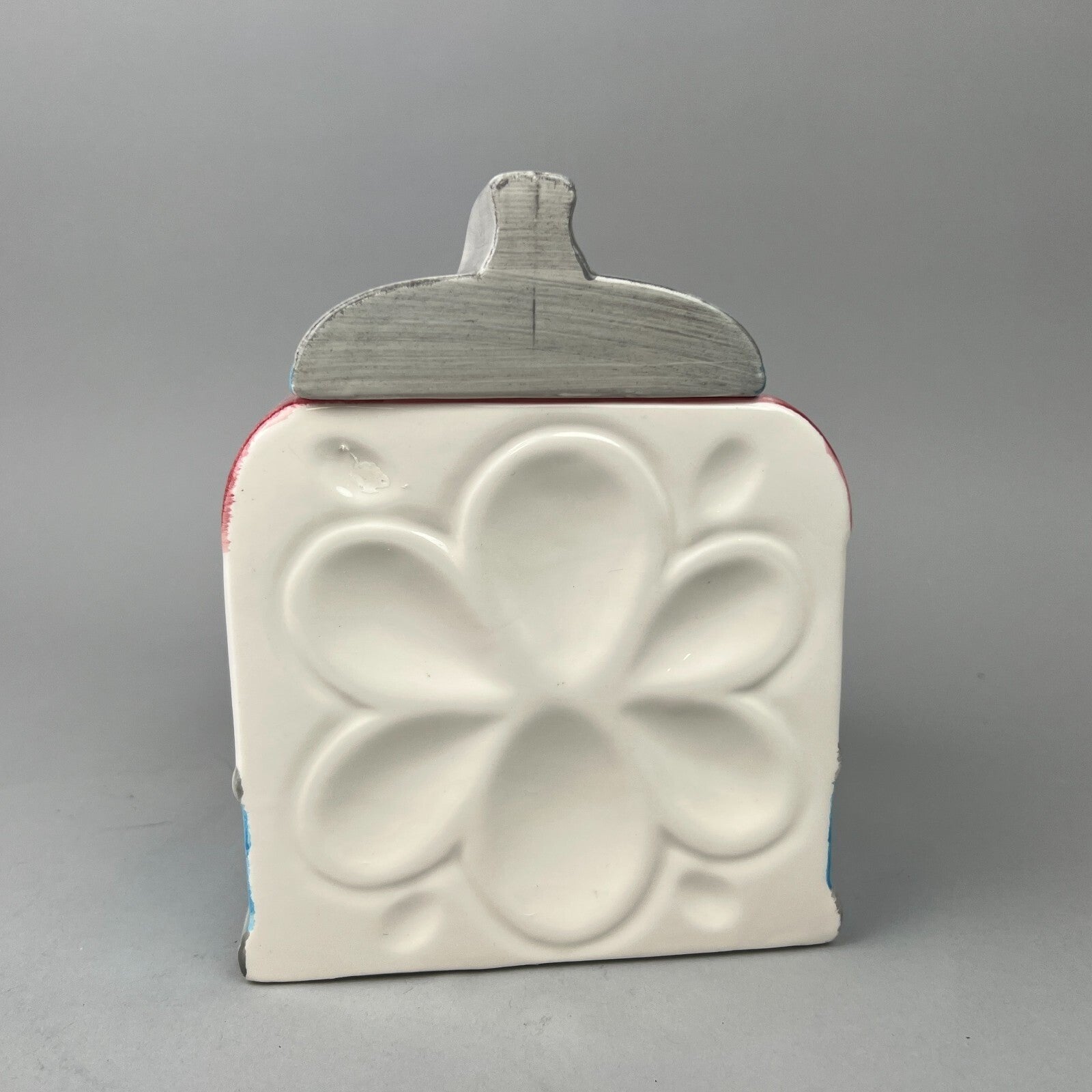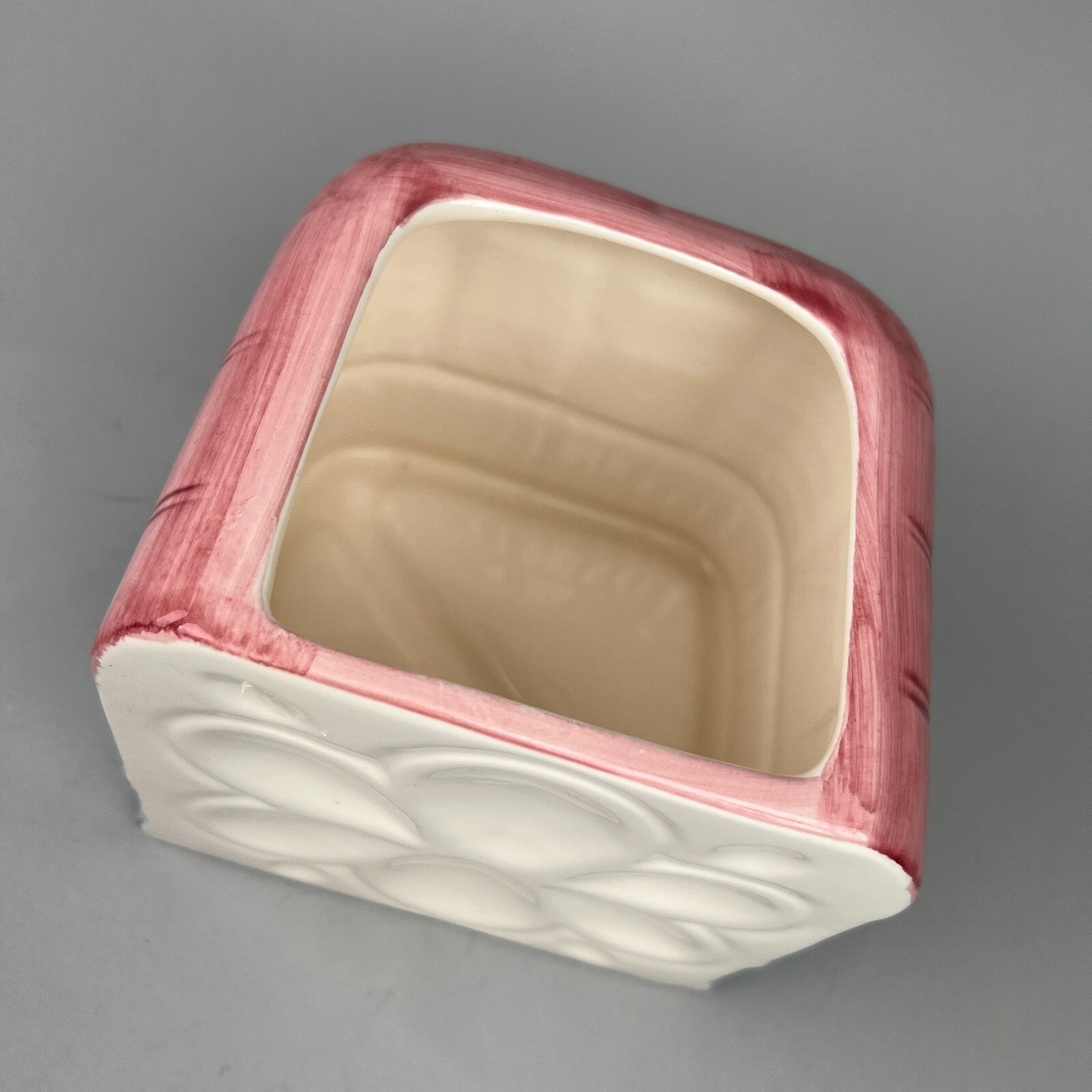 Charming vintage ceramic cookie jar shaped like a classic American diner, instantly adding a touch of retro nostalgia to any kitchen or collection. This delightful piece showcases a pink and white diner facade, complete with "Eat" and "Cola" signage, evoking a sense of 1950s Americana. The lid, styled to resemble a diner roof, fits snugly to keep cookies and other treats fresh. Perfect for adding a whimsical touch to your kitchen decor, serving as a unique gift for collectors, or displaying as a centerpiece at diner-themed parties.