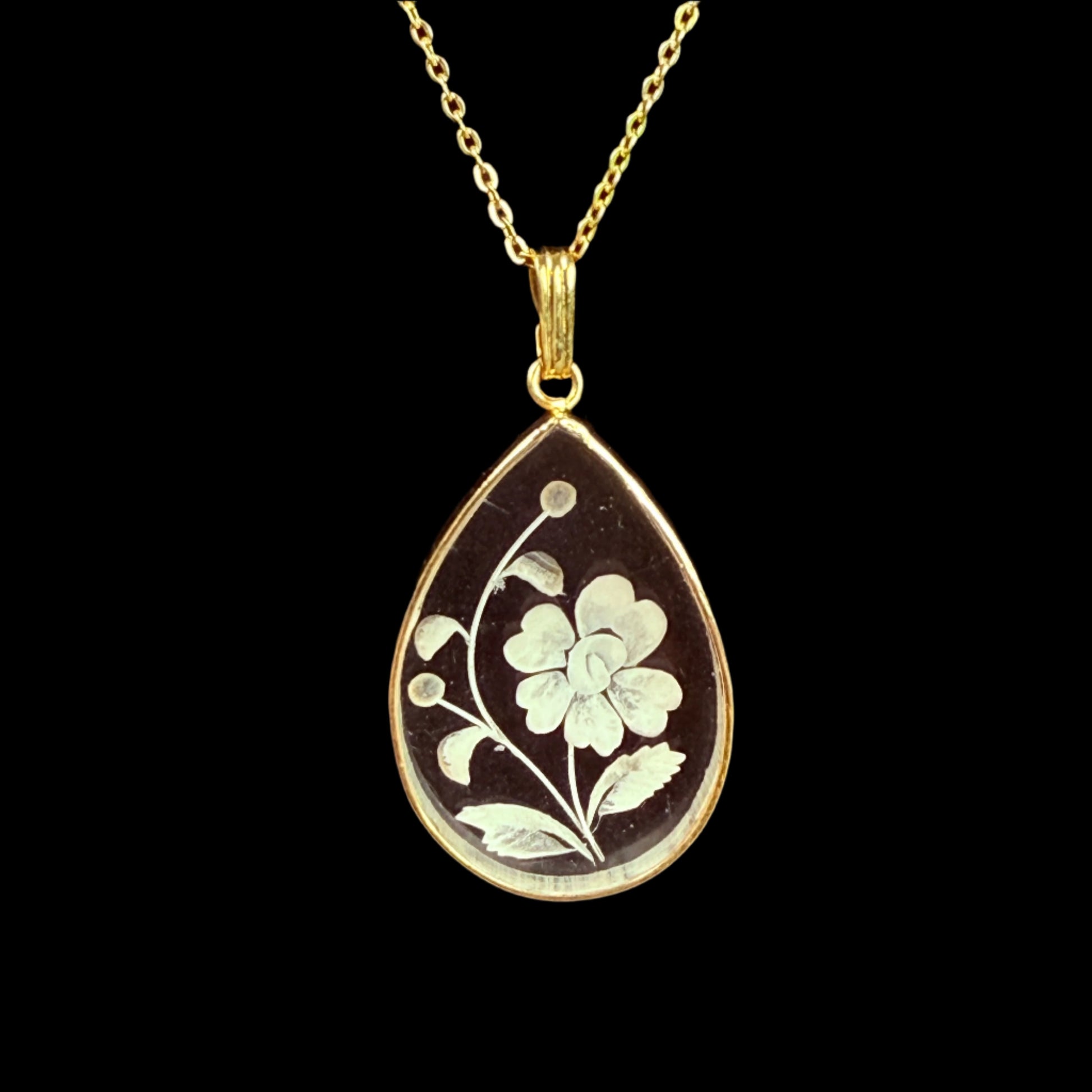 Vintage Etched Flower in Glass Pendant Necklace 16"