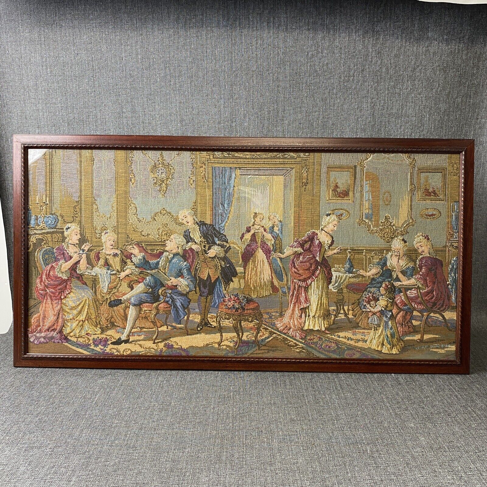 Vintage Large Tapestry Framed 40"x21" French Aristocrats Socializing