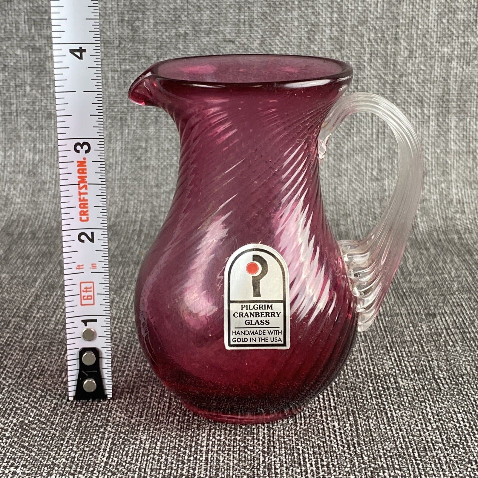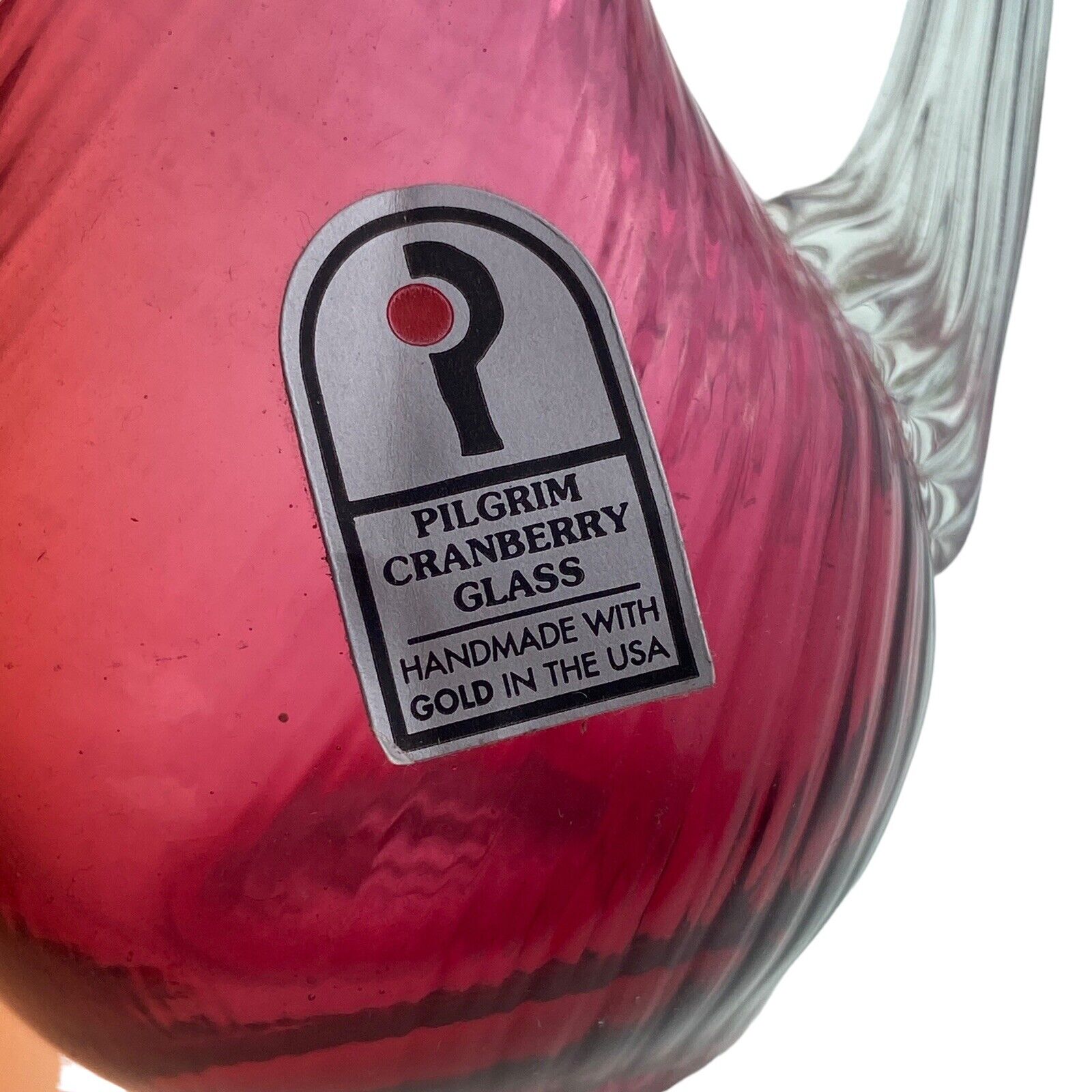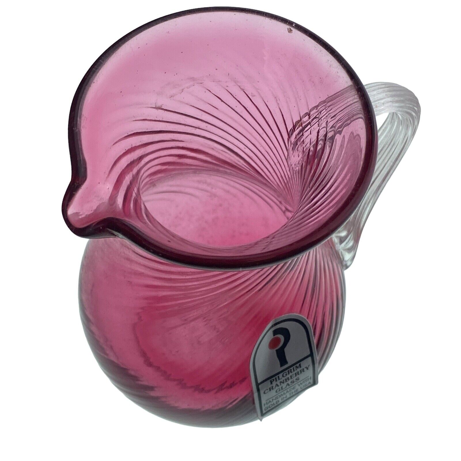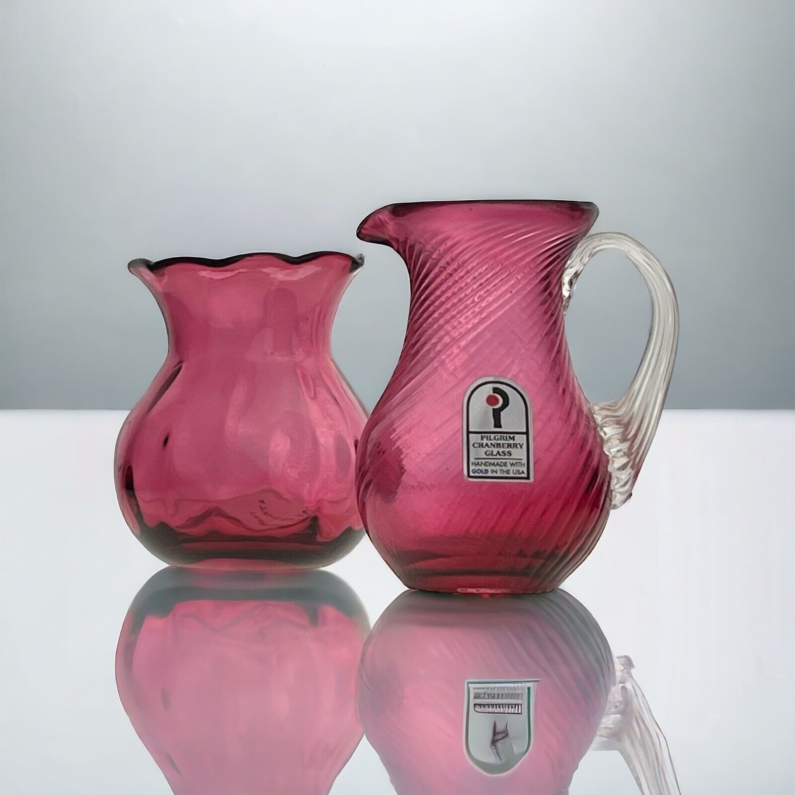 This elegant set includes a Vintage Pilgrim Cranberry Glass Vase and Pitcher, both handcrafted in the USA. Despite being preowned, they are in excellent condition with no chips or cracks. The pitcher even features a maker's sticker, as shown in the pictures.