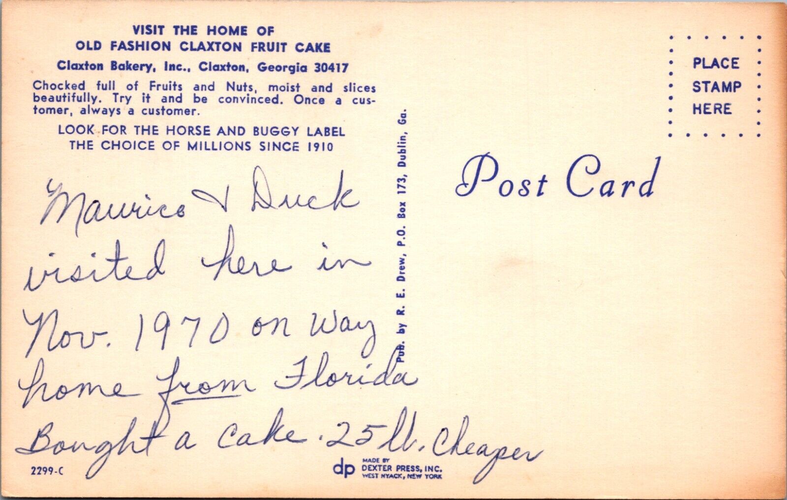 Vintage Postcard from The Home of Old Fashion Claxton Fruit Cake, Georgia