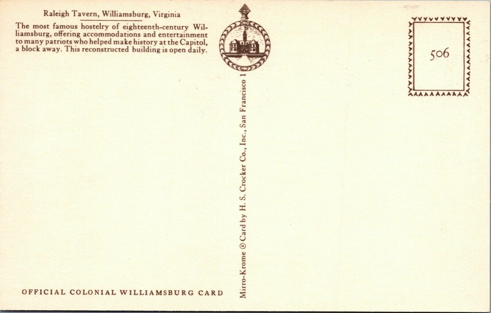 Vintage Postcard Raleigh Tavern, Williamsburg Virginia (Official Colonial Williamsburg)